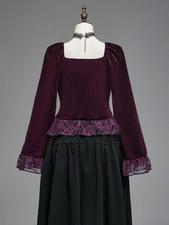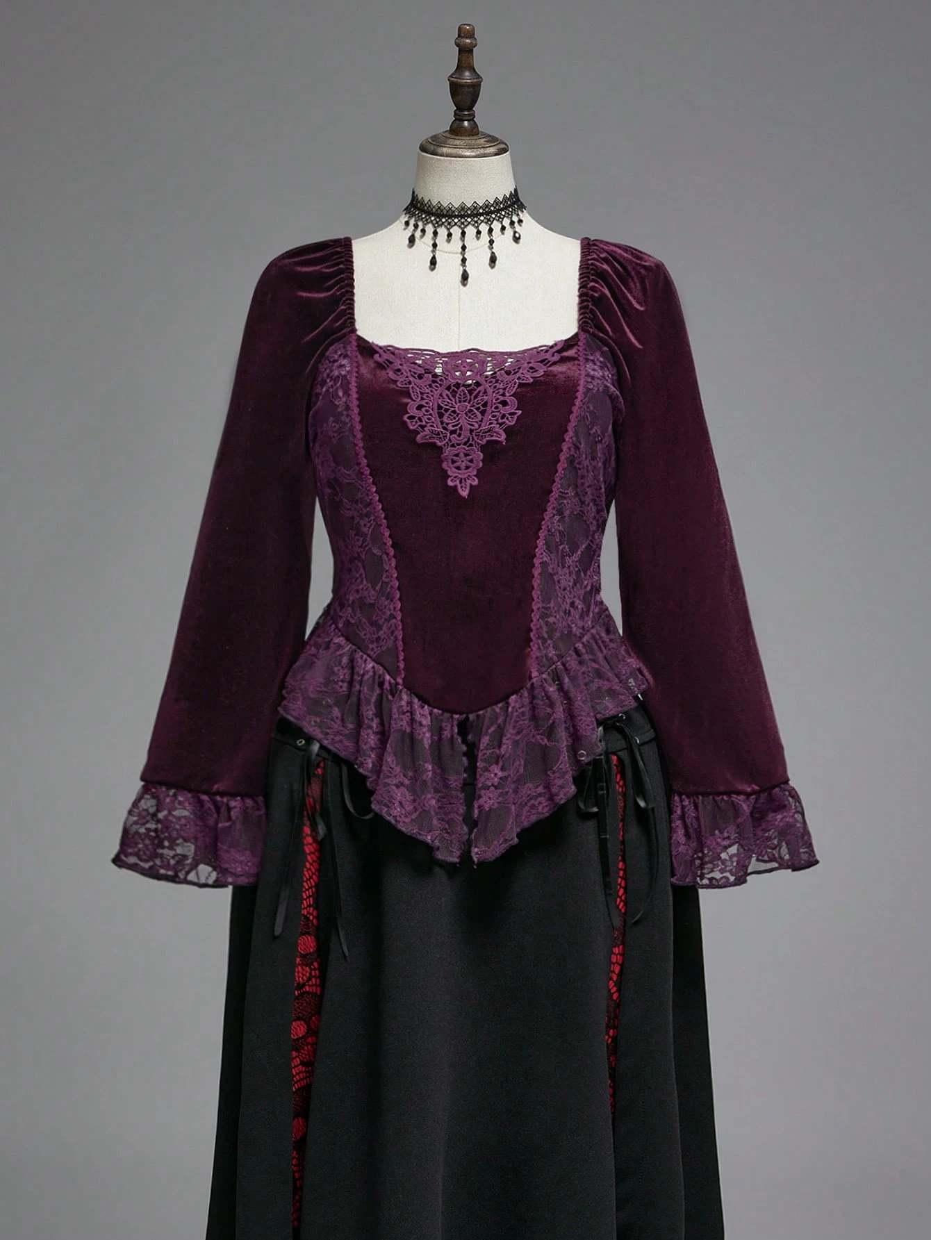 Hippie Plus Size Women Velvet & Contrast Lace V-Neck Flare Sleeve Blouse