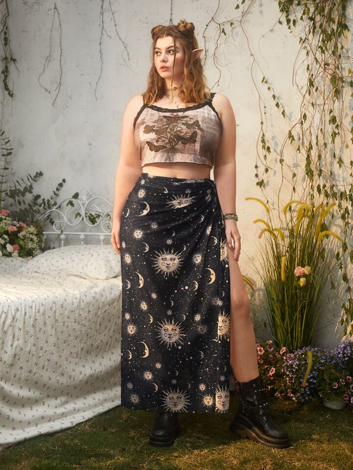 Hippie Plus Sun & Moon Print Knot Side Mesh Skirt