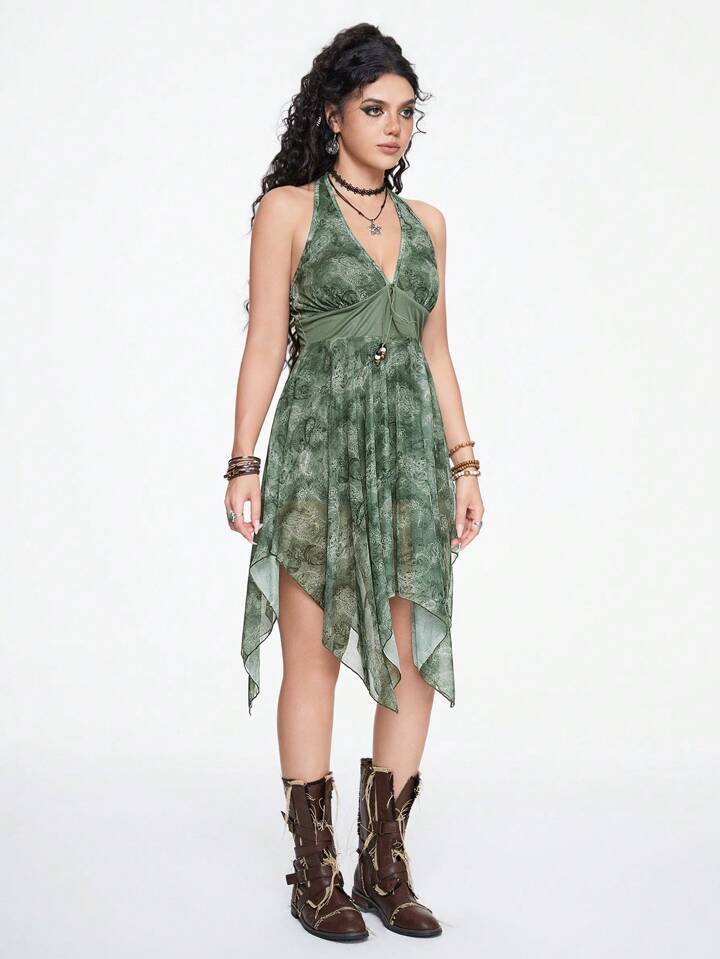 Hippie Printed Asymmetrical Hem Halter Dress