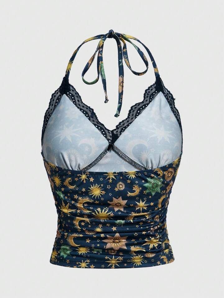 Hippie Queen Of Stars & Sun & Moon Pattern Halter Top With Gathered Waistband - Can Be Worn As A Neck Hanging Or Waist Belted Shirt