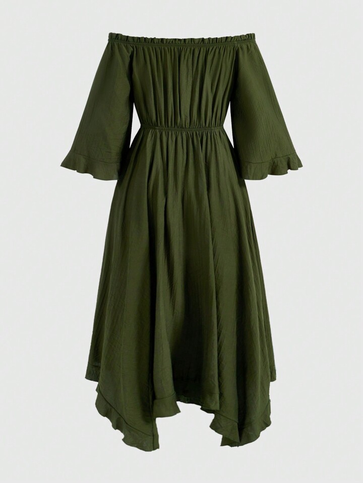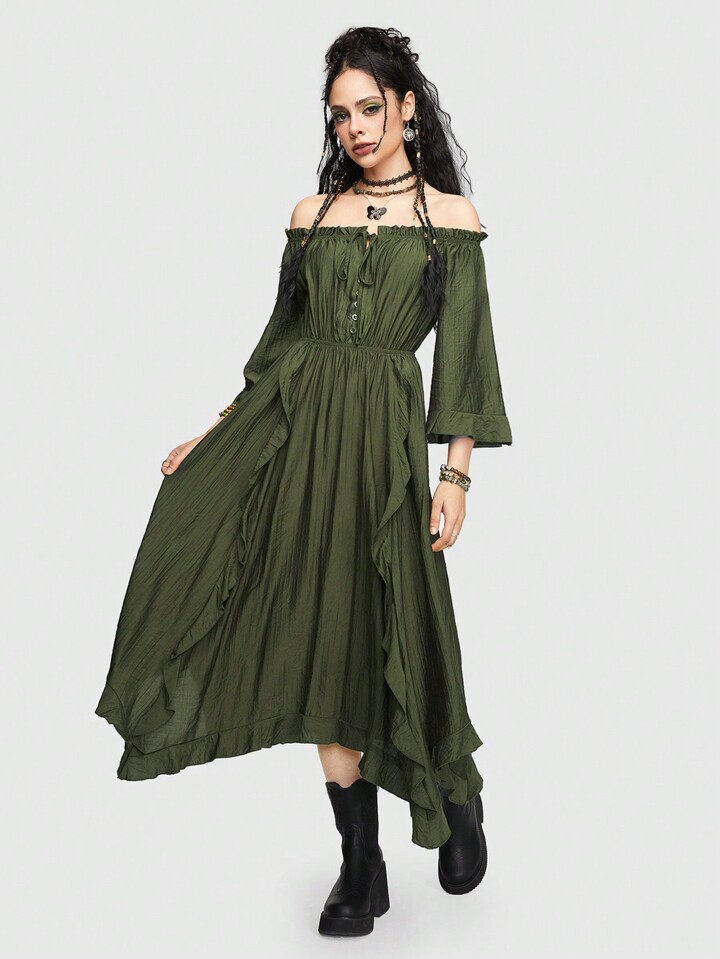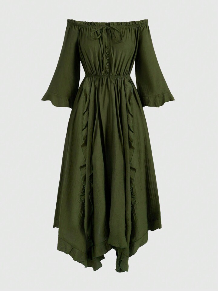 Hippie Solid Color Cross Tied Dress With Ruffle Trim And Off Shoulder Design
