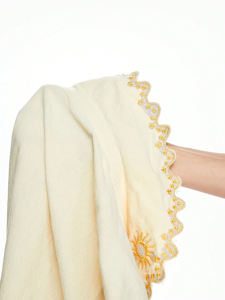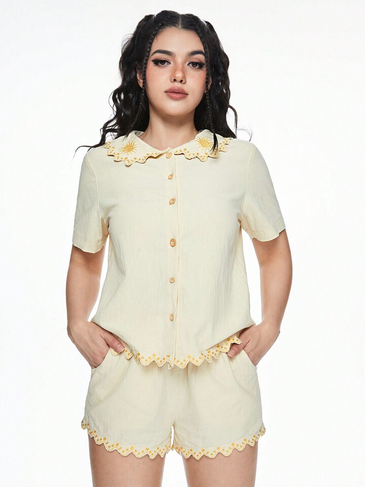 Hippie Style Sun Embroidered Women's Homewear Set With Fringed Hem