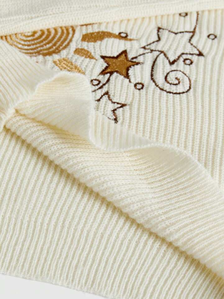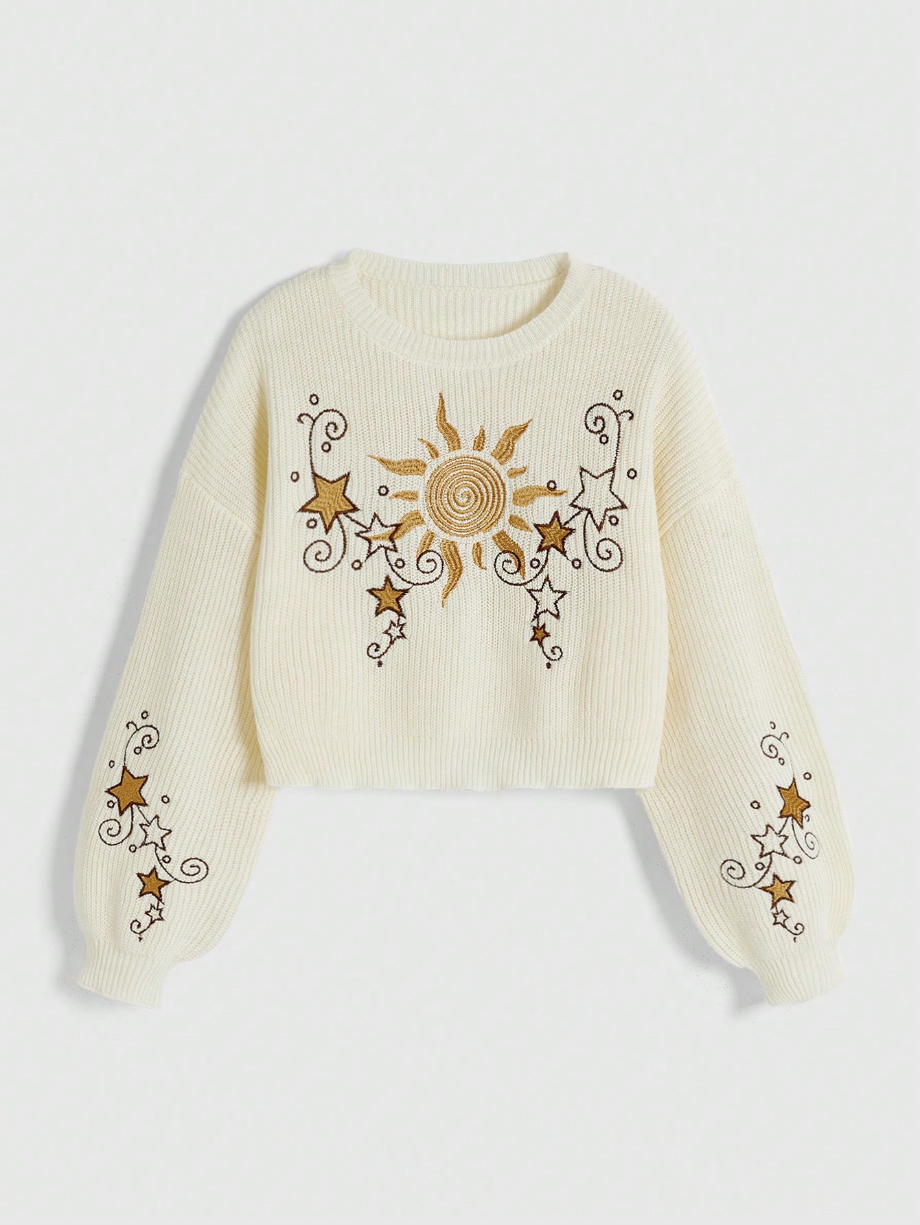 Hippie Style Sun & Star Embroidered Loose Cropped Pullover Sweater, Plus Size
