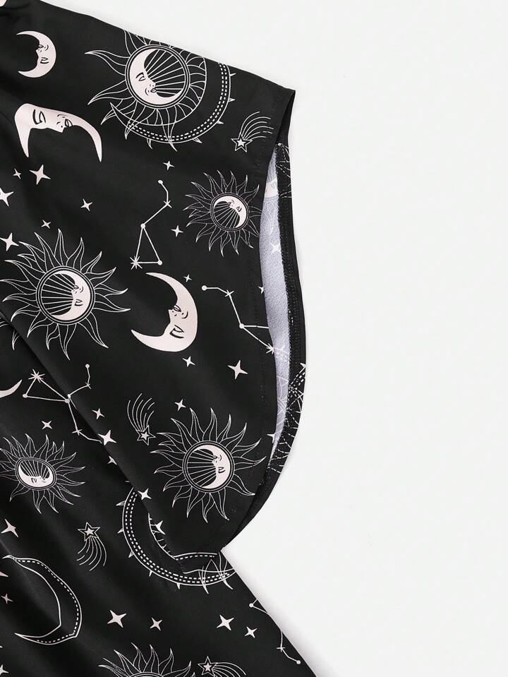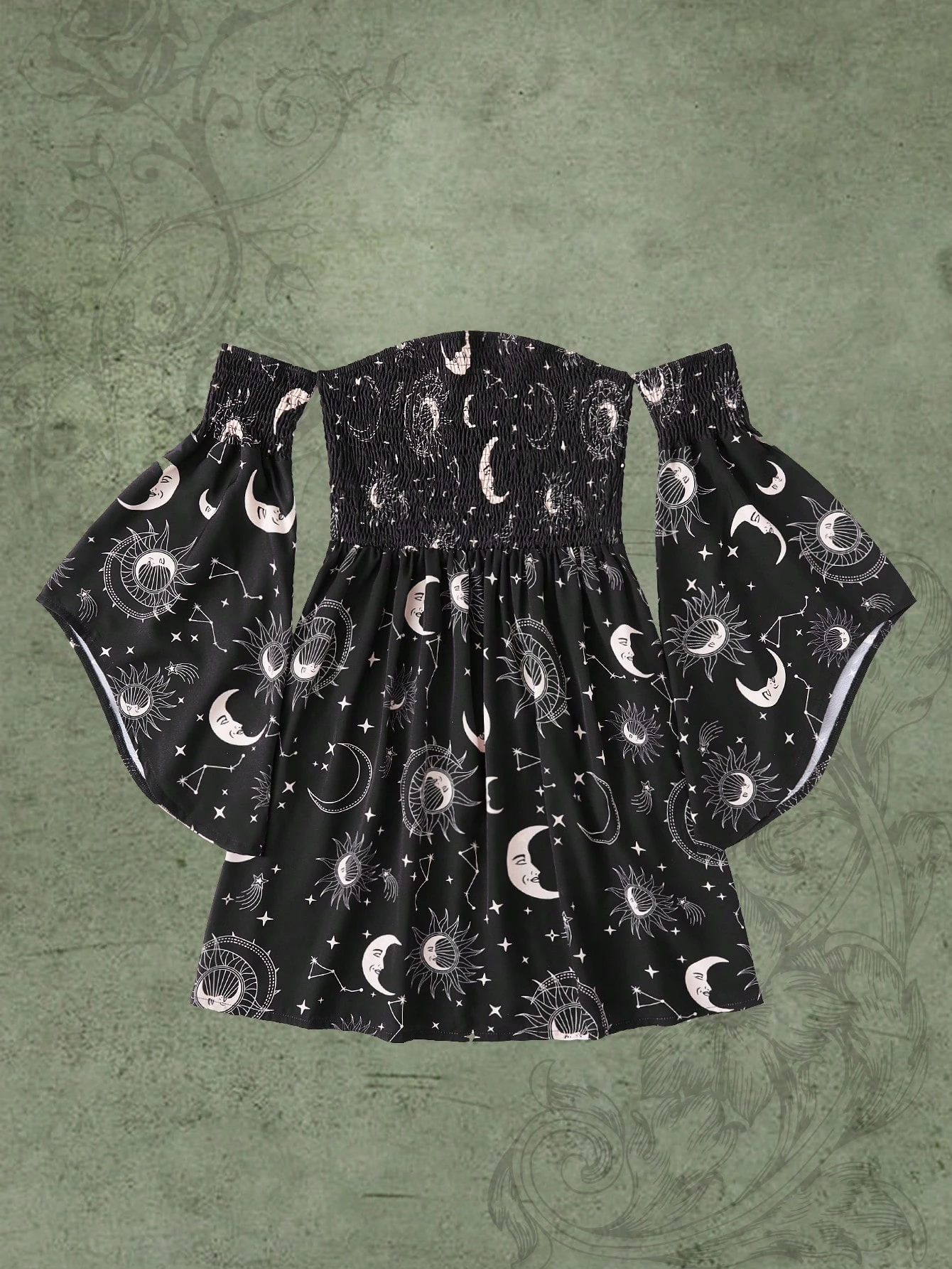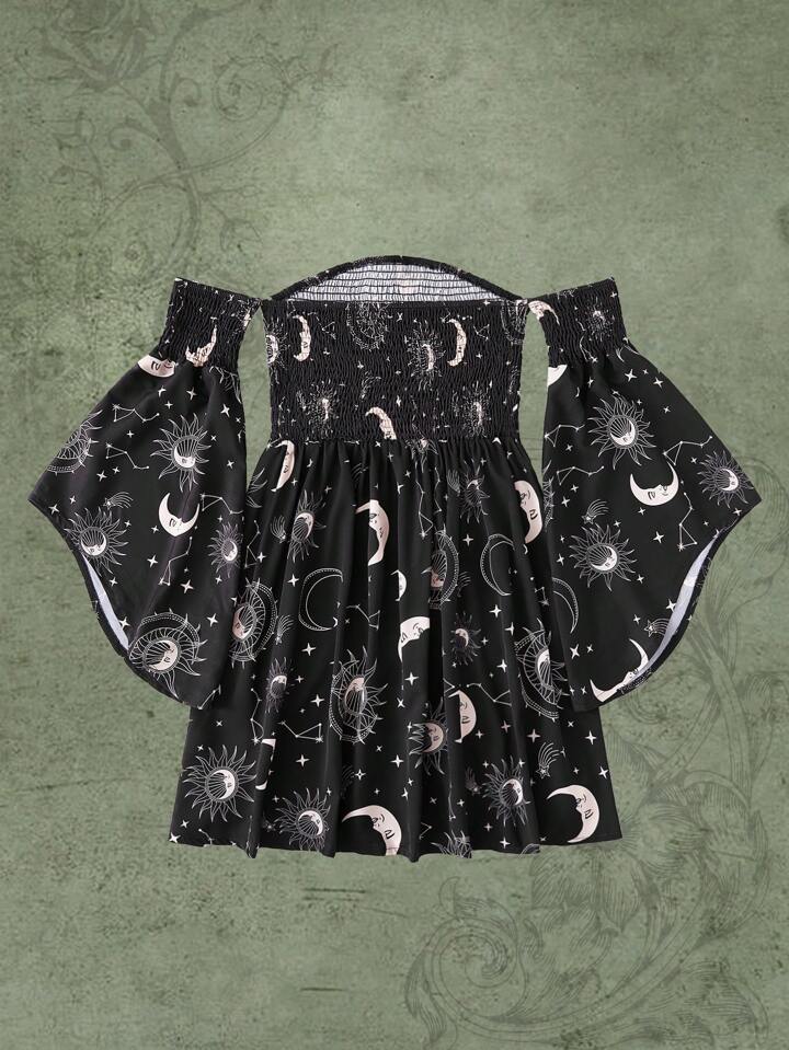 Hippie Sun & Moon Graphic Shirred Off The Shoulder Dress