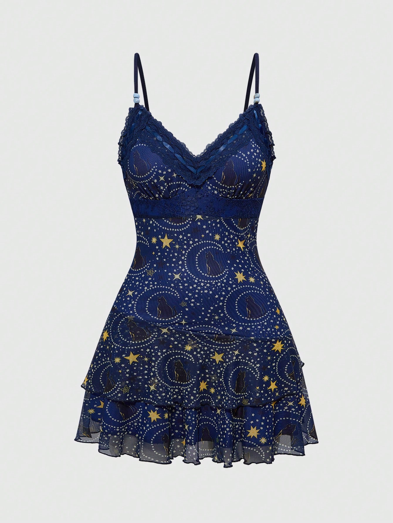 Hippie Women Moon & Star Print Casual Camisole Short Dress