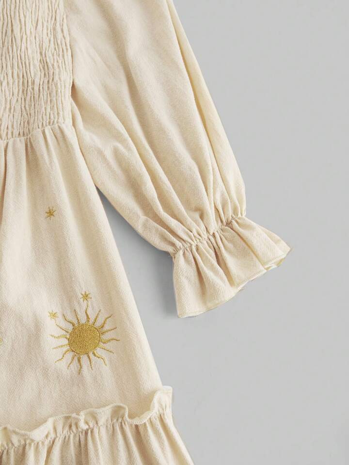 Hippie Women Retro Embroidered Long Dress With Puff Sleeves, Autumn/Winter