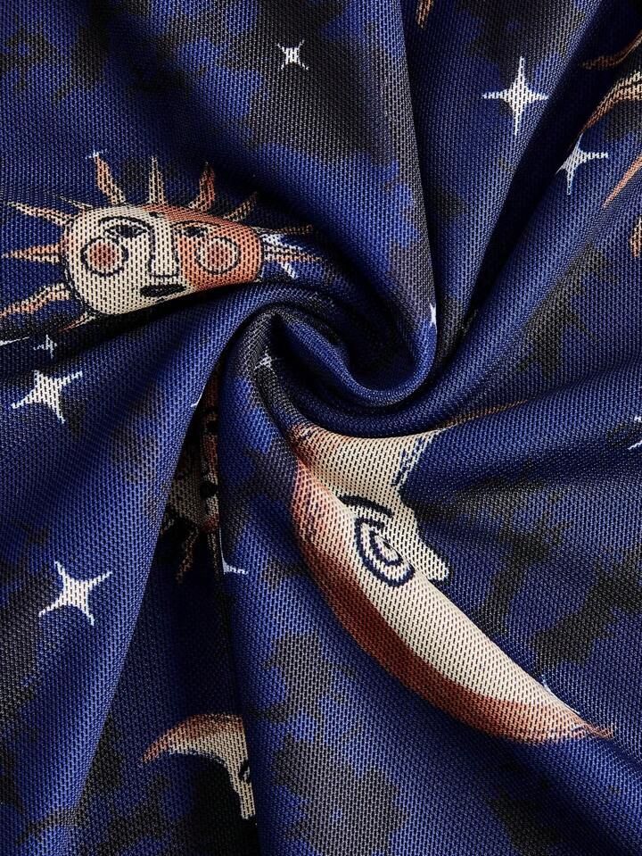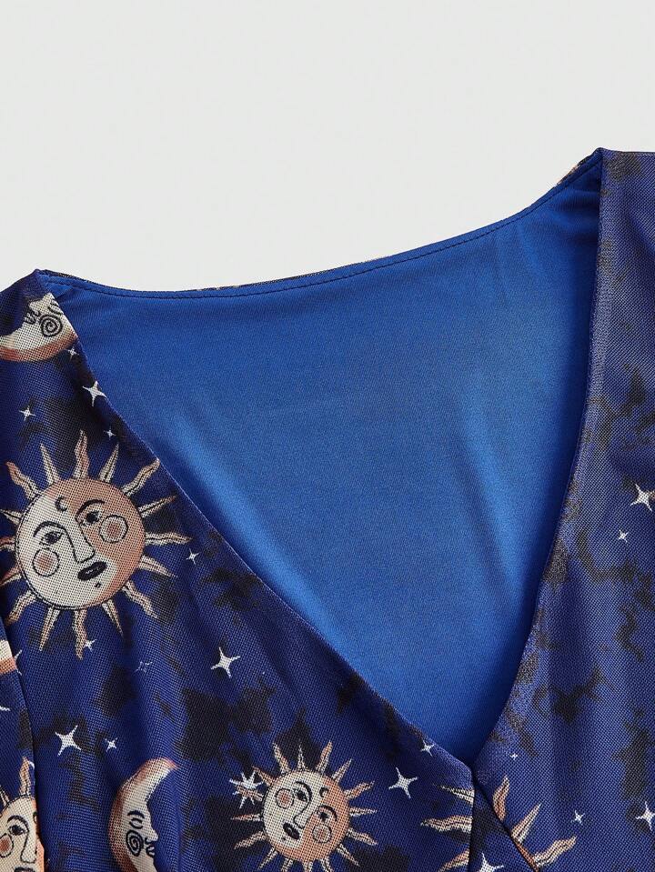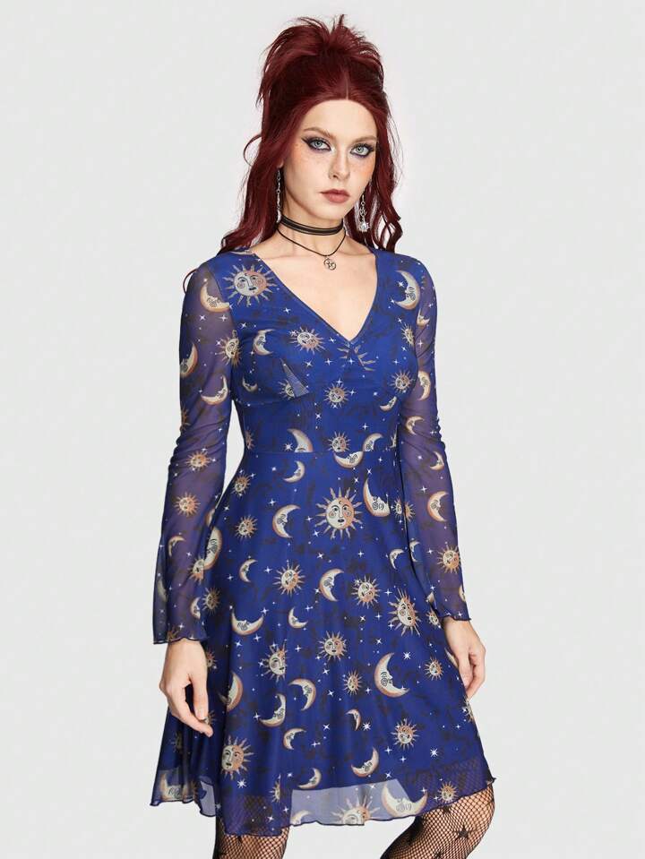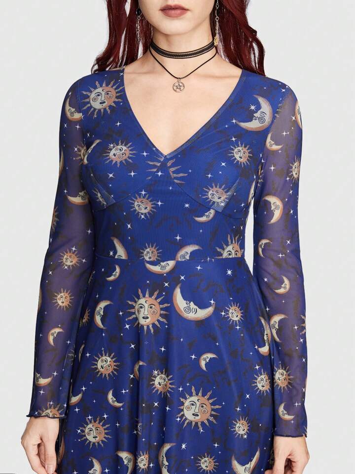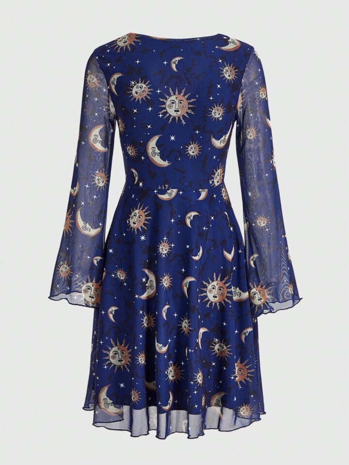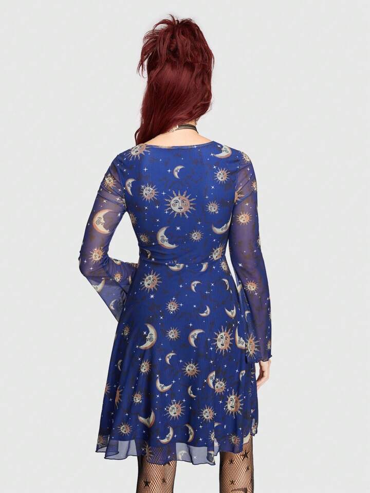 Hippie Women'S Mesh Flare Sleeve Dress With Sun, Moon And Star Pattern