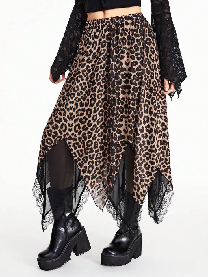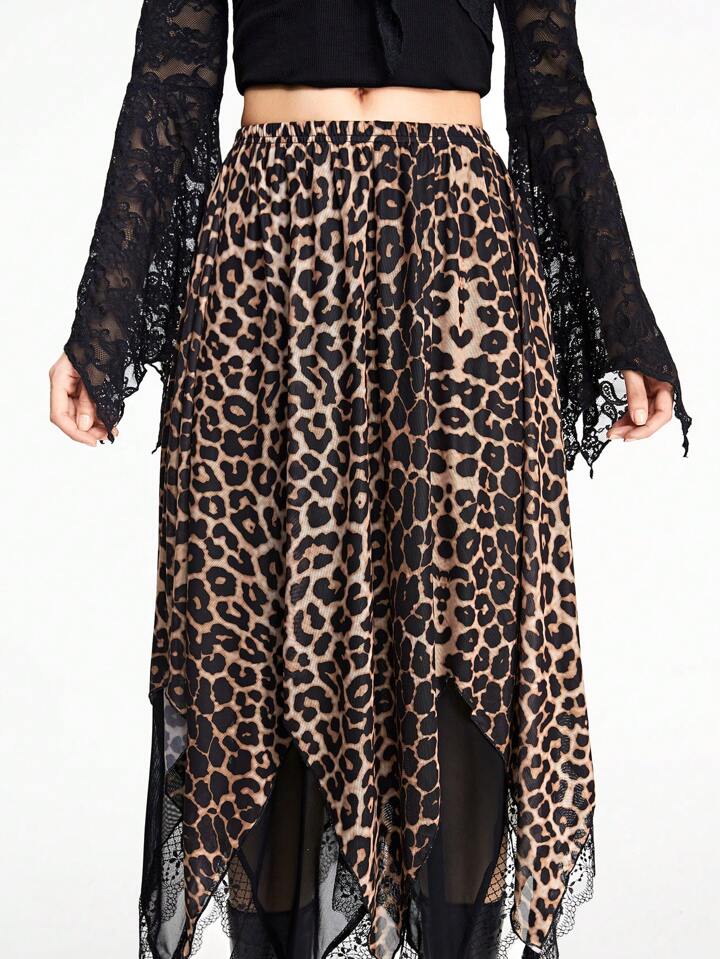 Hippie Women's Bohemian Style Leopard Pattern Mesh Lace Patchwork Asymmetric Hem Skirt
