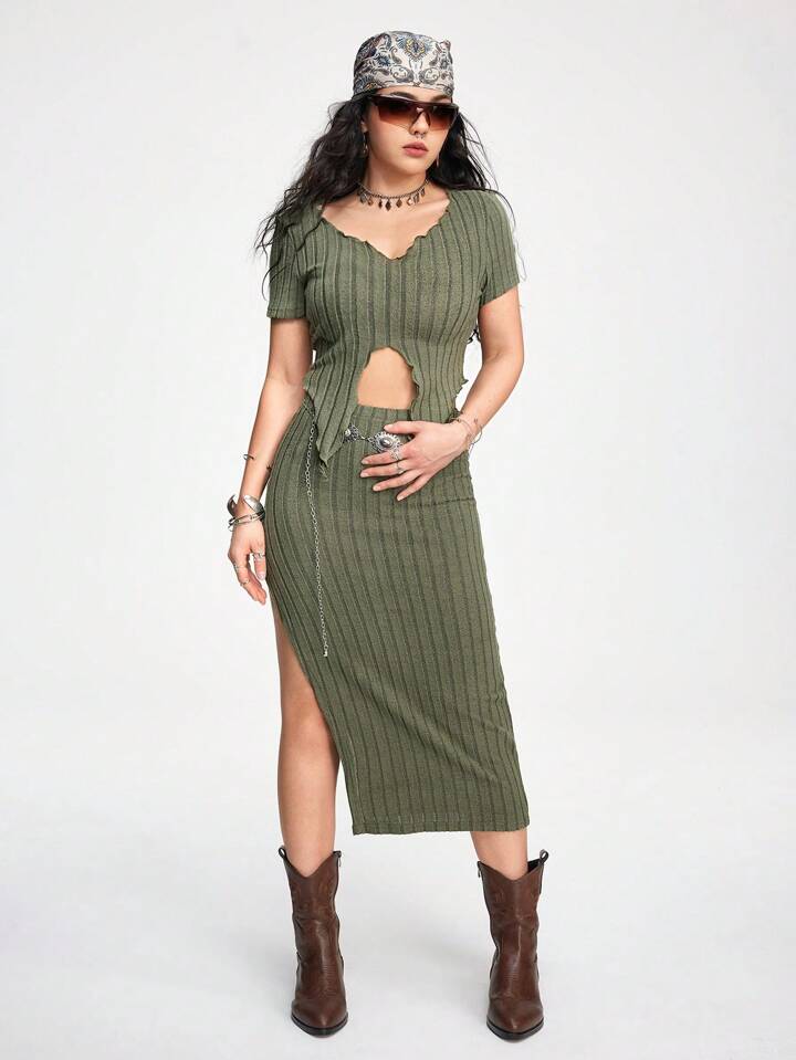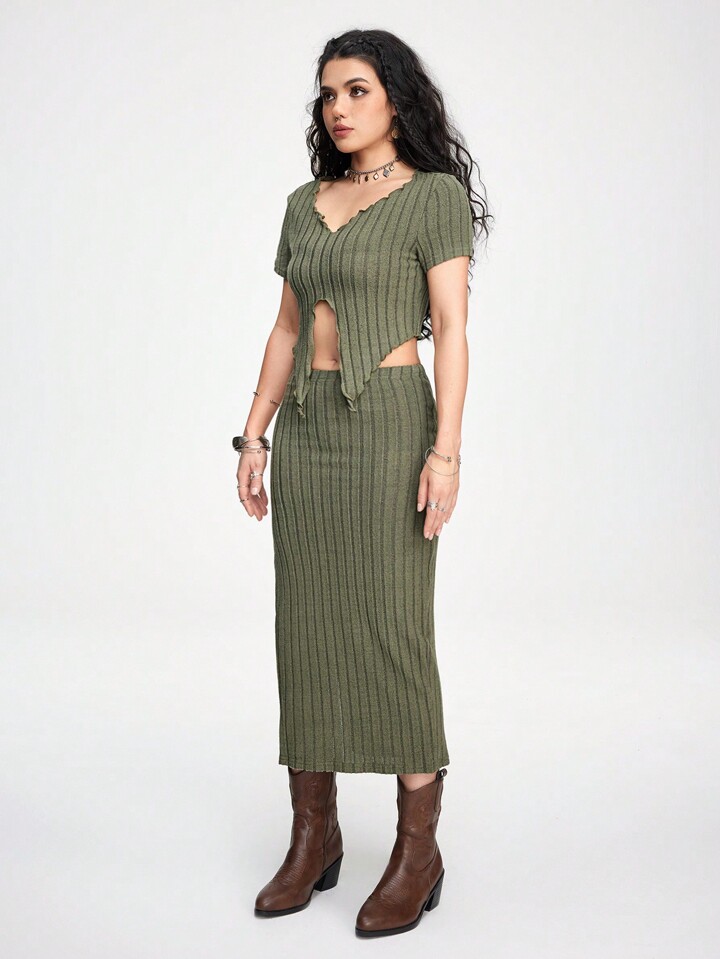 Hippie Women's Short Sleeve Top With High Slit Skirt Two-Piece Set