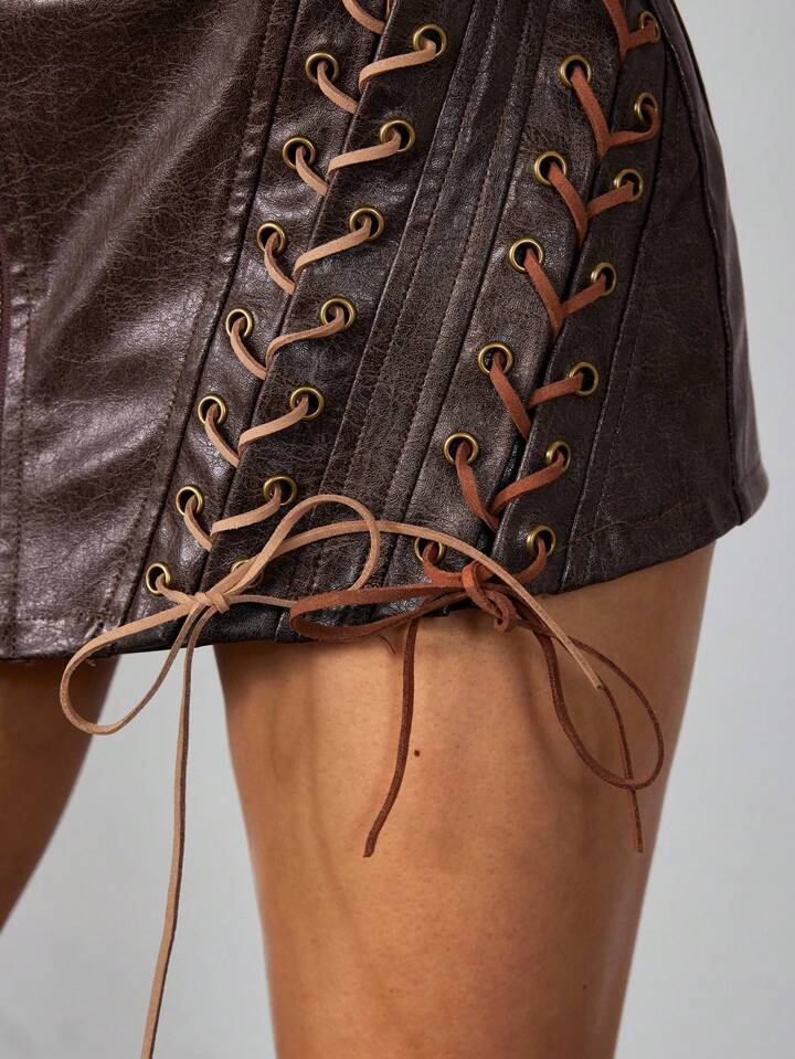 Hippie Women's Summer Casual Street Chic PU Leather Lace-Up Zipper Front Mini Skirt