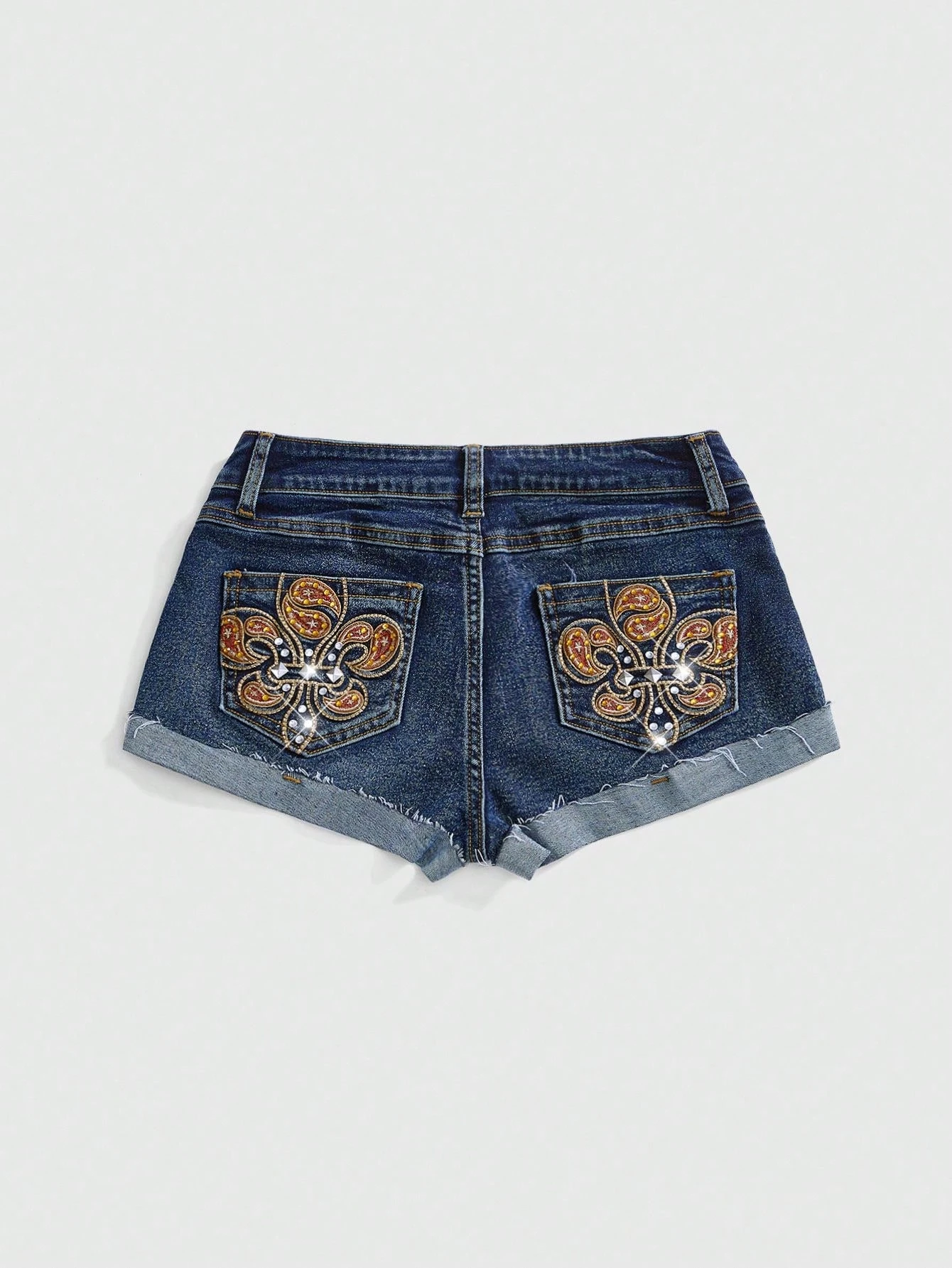 Women's Vacation Style Vintage Hippie Paisley Embroidered Studded Low Waist Mini Denim Shorts