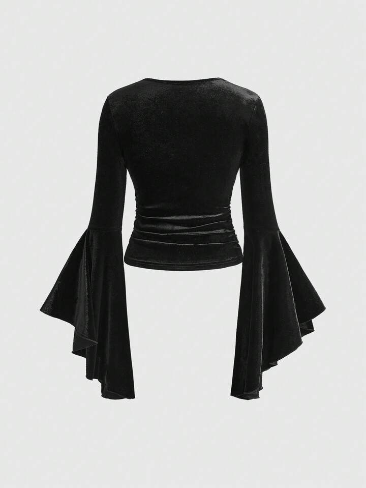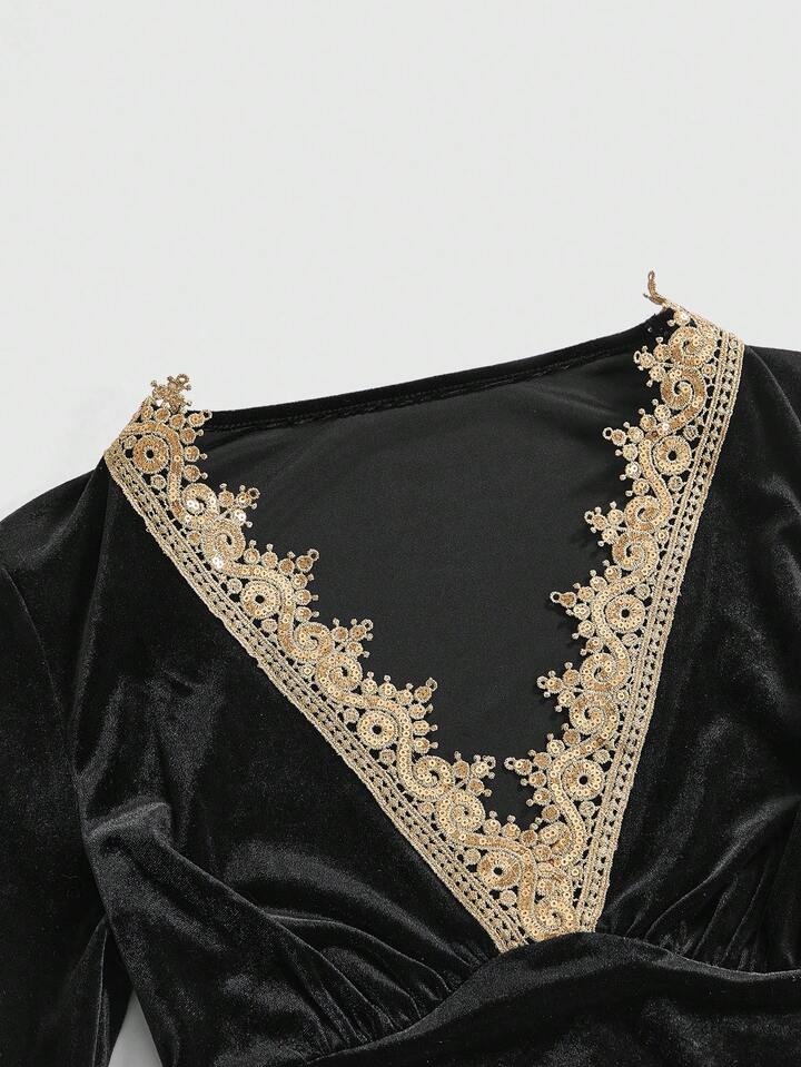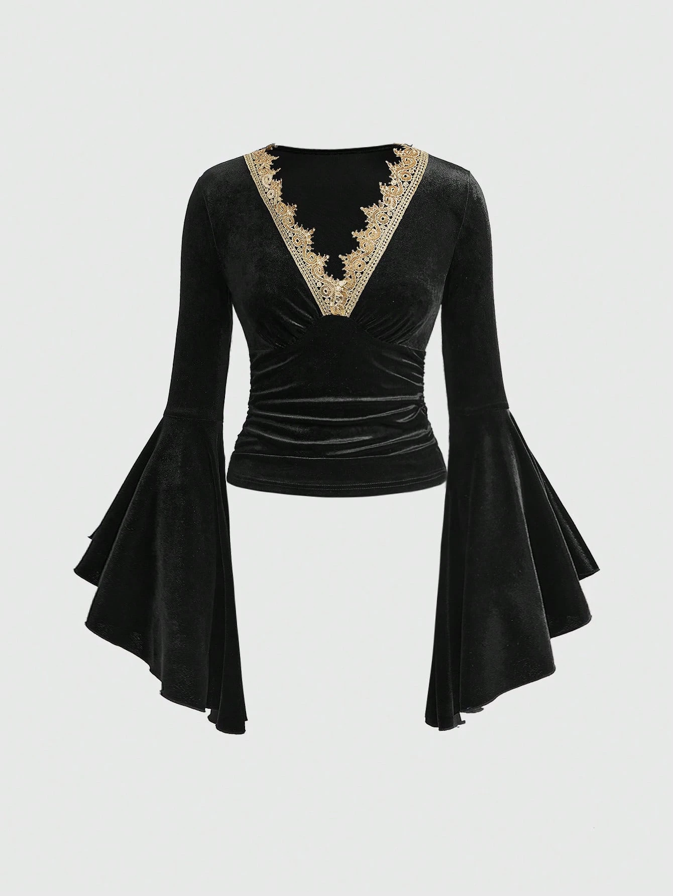 Hippie Women's Vintage Floral All-Over Print Patchwork Lace Bell Sleeve V-Neck Fitted Velvet Top, Halloween Witch Theme, Autumn/Winter