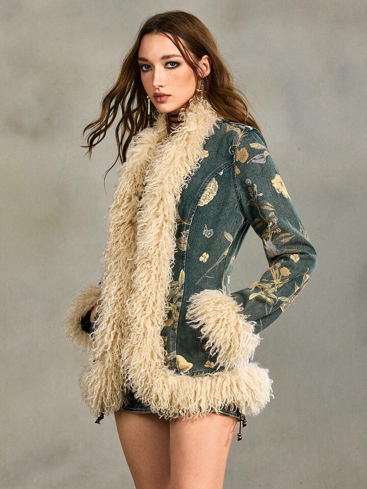 Hippie Y2K Retro Floral & Plant Full Print Faux Fur Patchwork Fitted Women Denim Jacket