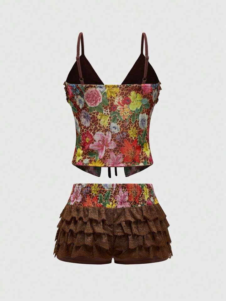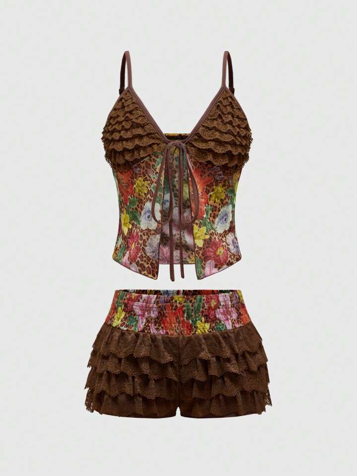 Hippie Y2K Vintage American Style Sexy Lace & Mesh Top With Ruffle Hem Shorts 2Pcs Outfit For Women