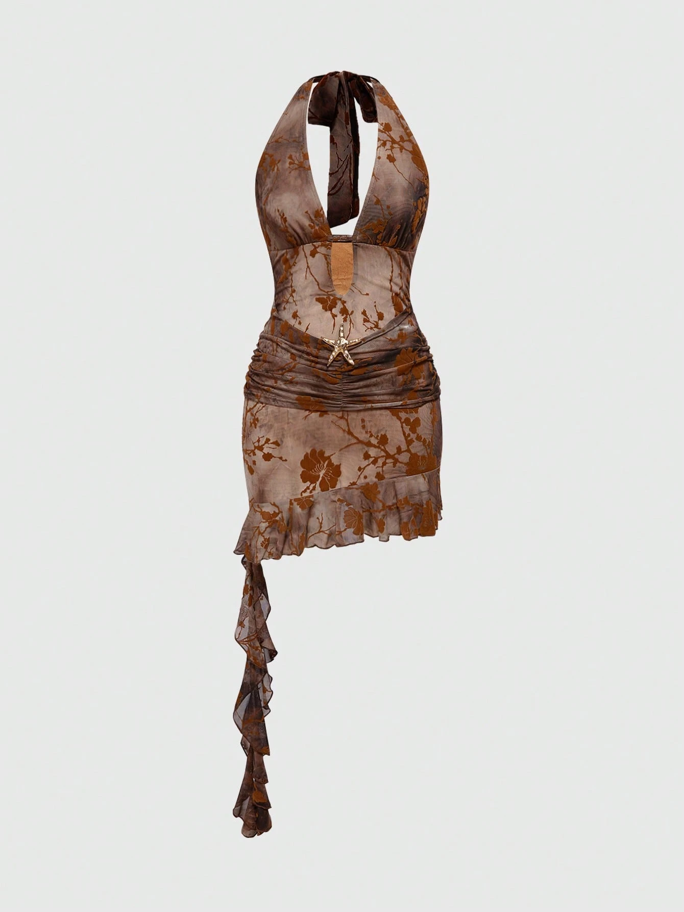 Hippie Y2K Vintage Sexy Halter Open Back Starfish Metal Decor Women Mini Dress