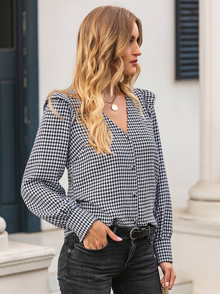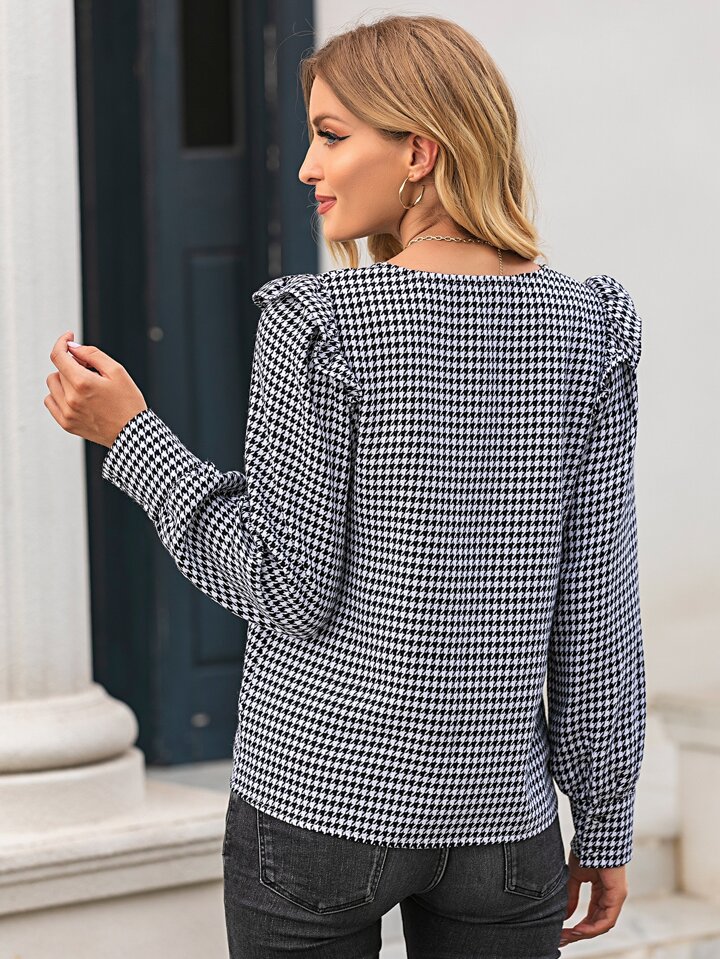 Houndstooth Ruffle Trim Button Up Blouse