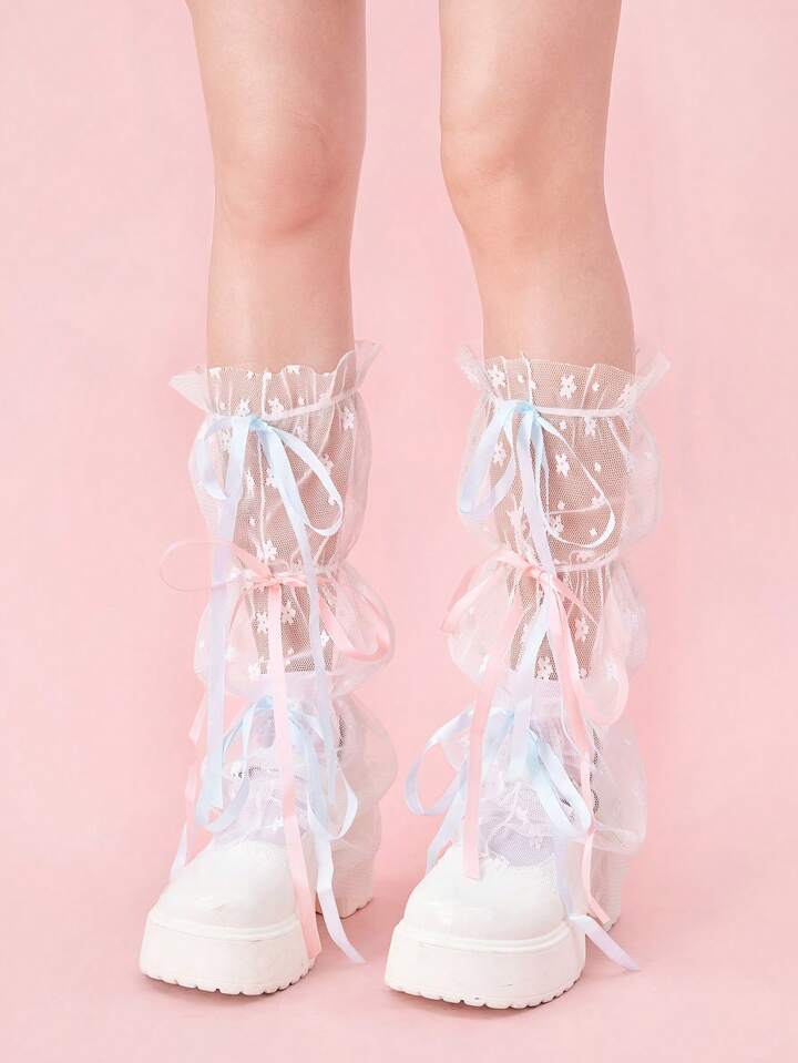 J-Fashion 1pair Colorful Ribbon Bow Lace Thigh High Socks For Women