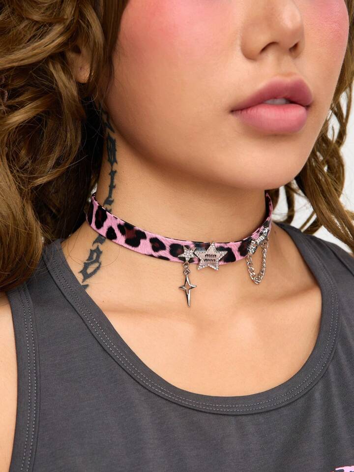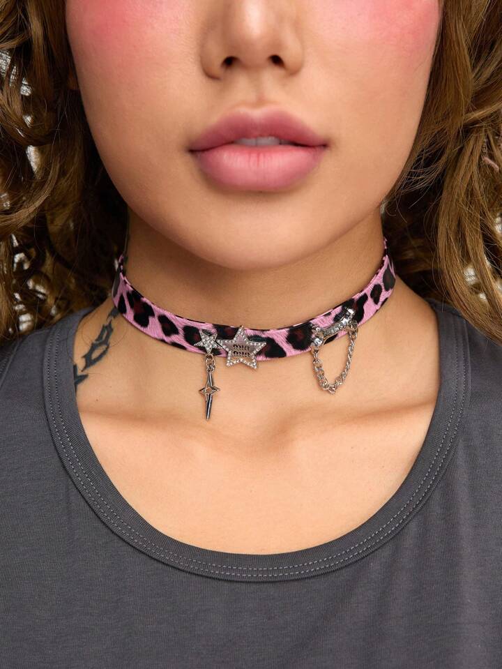 J-Fashion 1pc Hot Pink Leopard Print Bone Shaped Pendant Necklace With Rhinestones And Star Detail