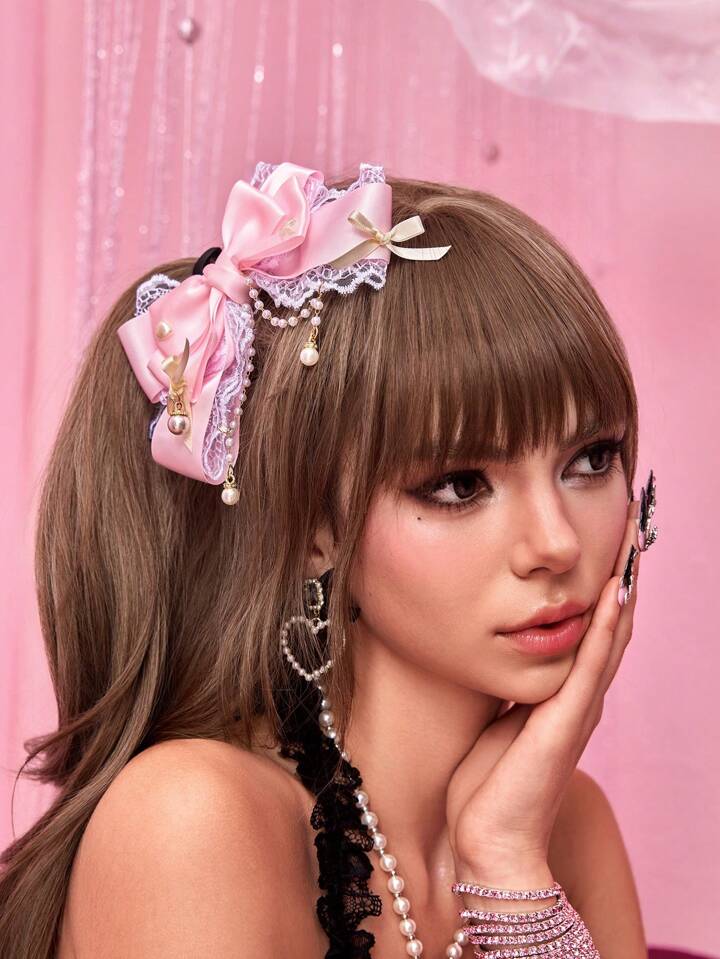 J-Fashion 1pc Pink Bowknot & Star Element Beaded Hair Clip, Cute Sweet Style White Lace Edged Hair Clip, Handmade Lolita Tea Party Pearl Rhinestone Hair Accessory Claw Clips Hair Claws Hair Barrettes
