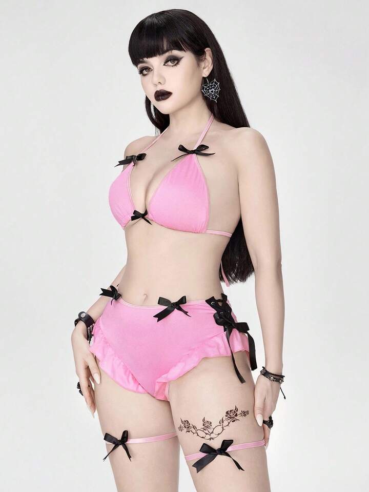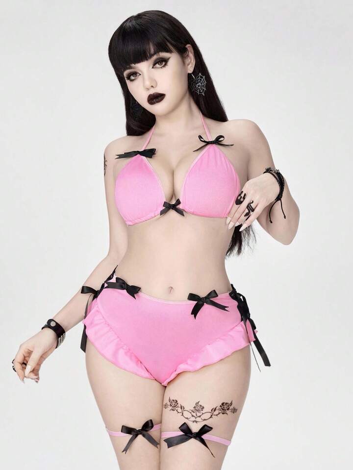 J-Fashion 4pcs Y2K Harajuku Babe Triangle Bra, Panty, Leg Garter, Fishnet Lingerie Set For Women