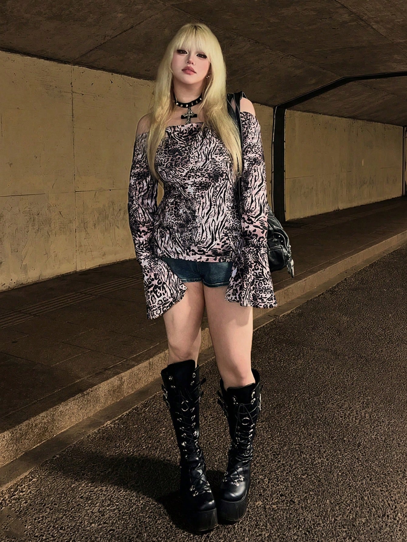 J-Fashion Grunge-Punk Retro Leopard Print Ruffle Flare Sleeve Edgy Avant-Garde Leopard Pattern Sexy Crop Top Off-Shoulder Plus Size Women Blouse, Leopard Print Blouse