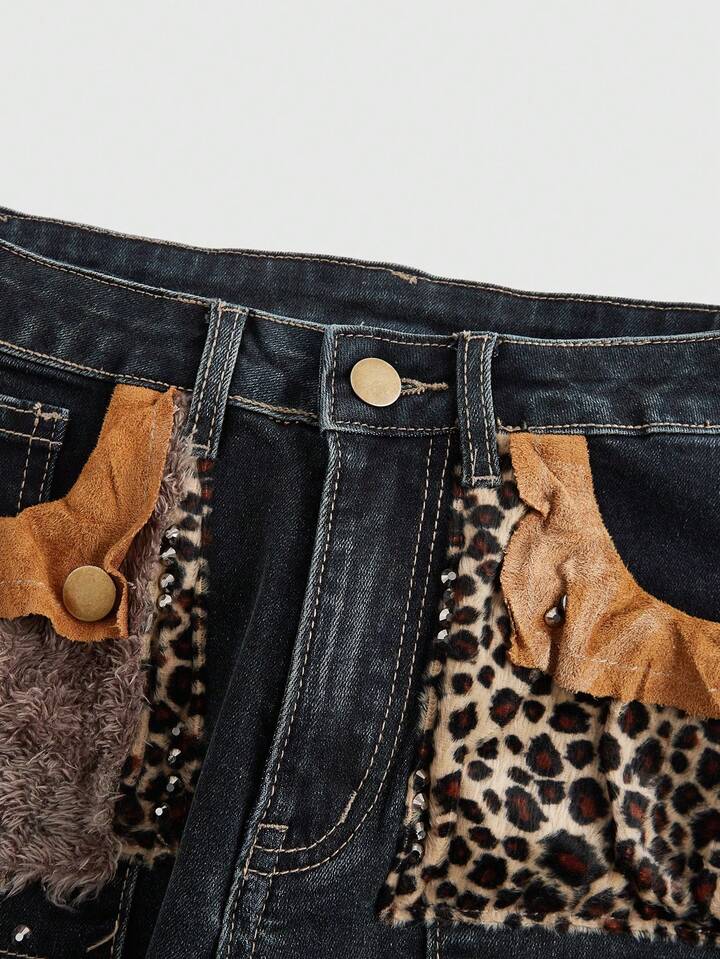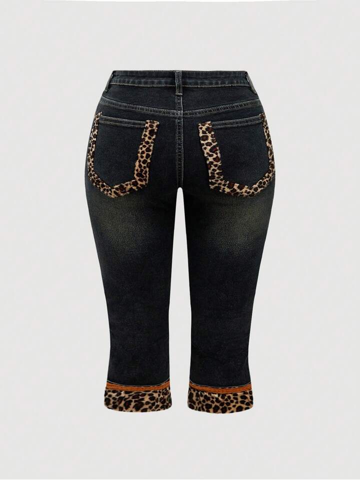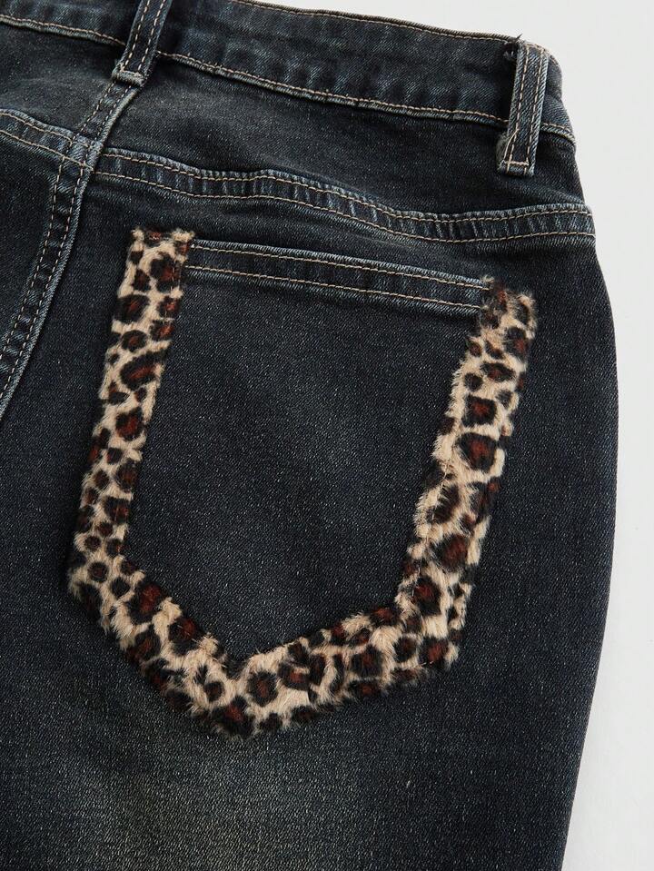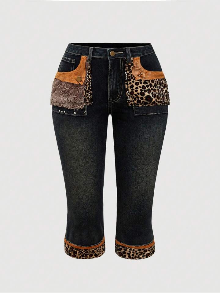 J-Fashion Plus Size Women Vintage Y2K Low Waist Leopard Patchwork Denim Jeans, Autumn/Winter