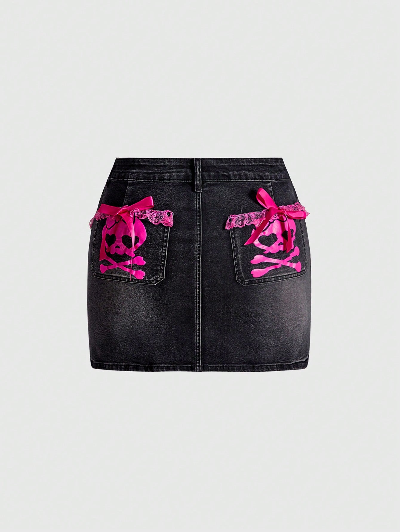 J-Fashion Plus Size Y2K Harajuku Baddie Sexy Pink Skeleton Ribbon Bow Lace Denim Mini Skirt