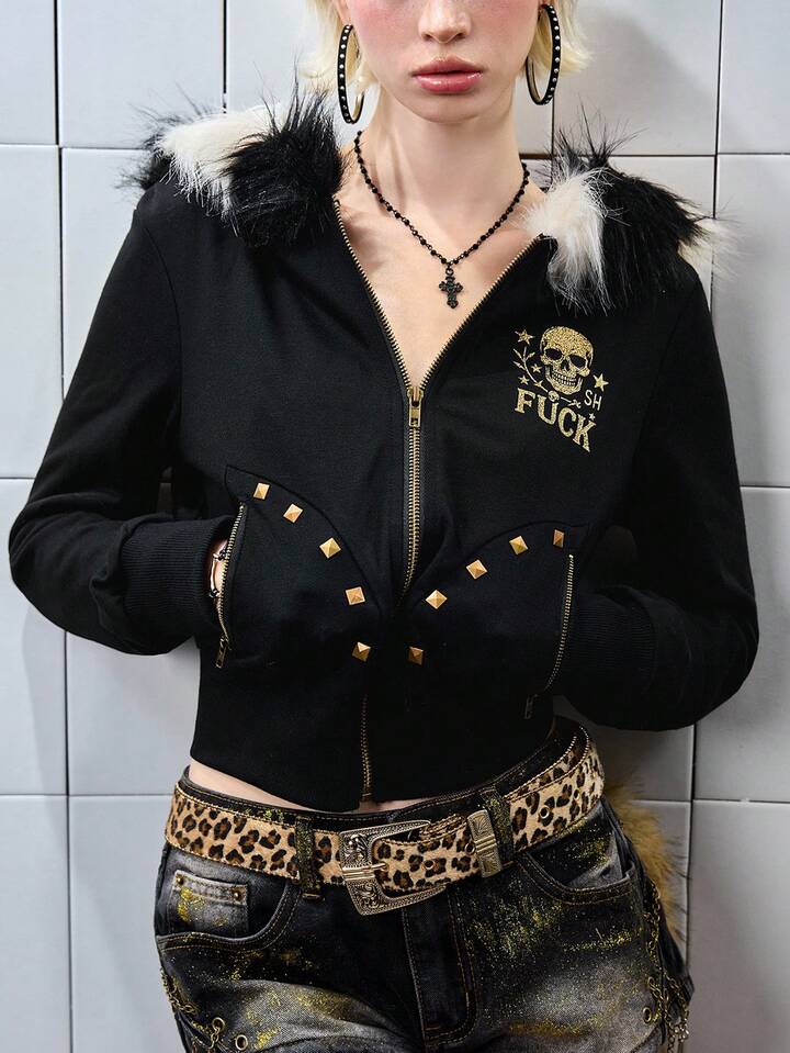 J-Fashion Shibuya Girl Chic Bronze Rivet Contrast Fuzzy Trim Fitted Cropped Women Hoodie Jacket