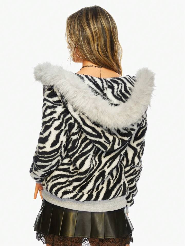 J-Fashion Snow Y2K Gyaru Harajuku Hottie Zebra Print Fuzzy Hooded Regular Jacket For Women