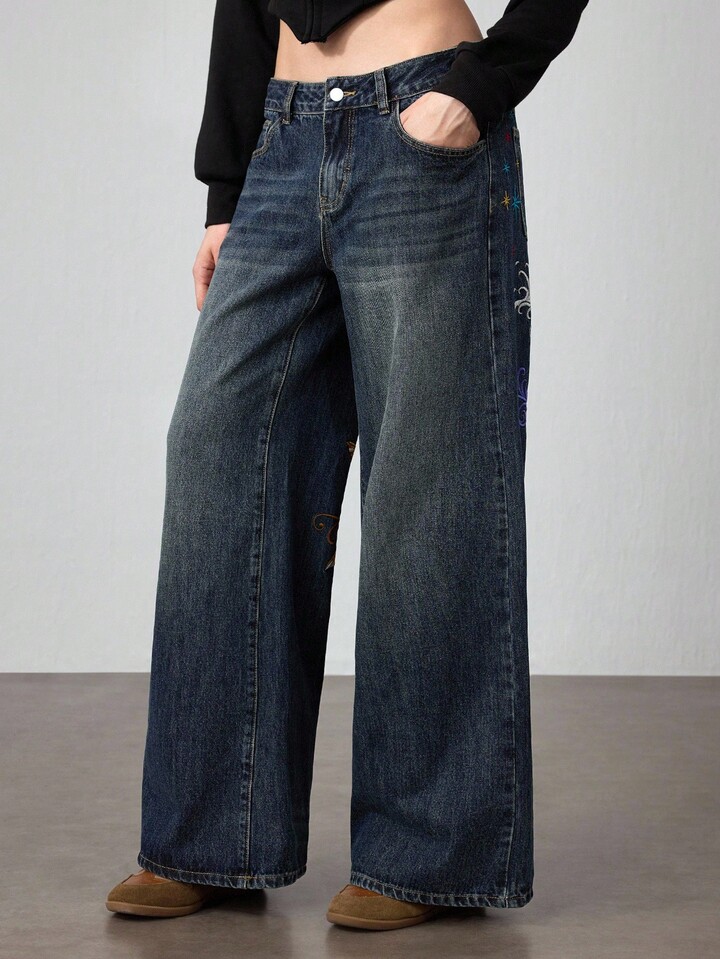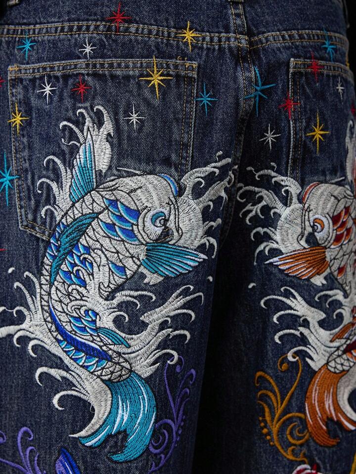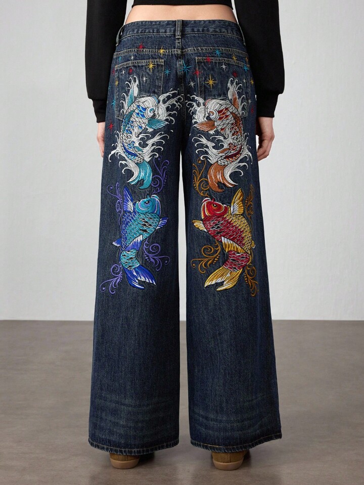 J-Fashion Unisex Retro Hip Hop Subculture Carp Floral Embroidery Loose Wide-Leg Low Waist Jeans