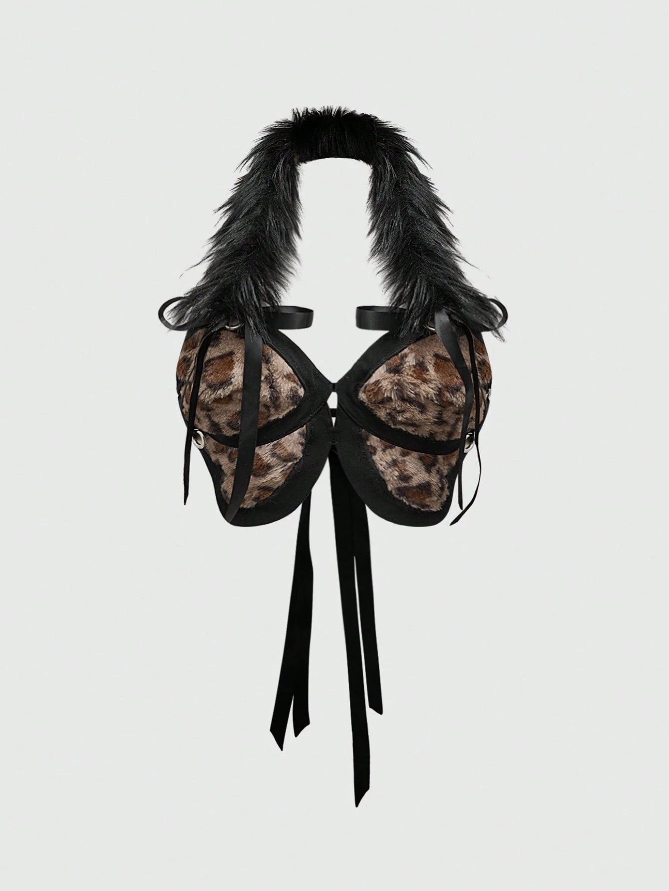J-Fashion Women Plus Size Furry Halter Neck Sexy Leopard Print Bowknot Back Tank Top