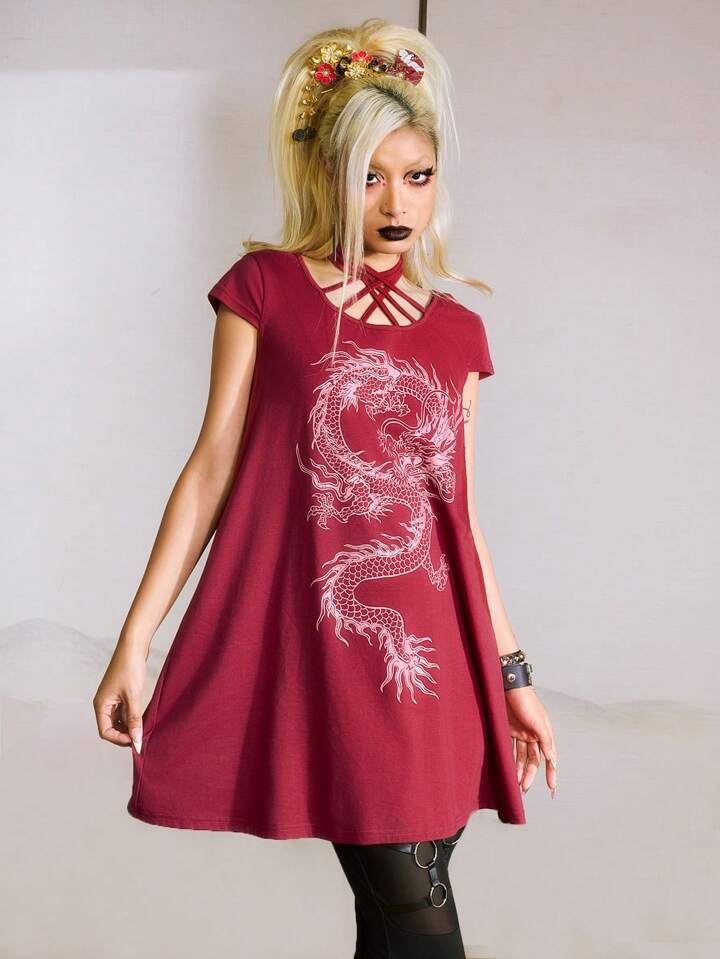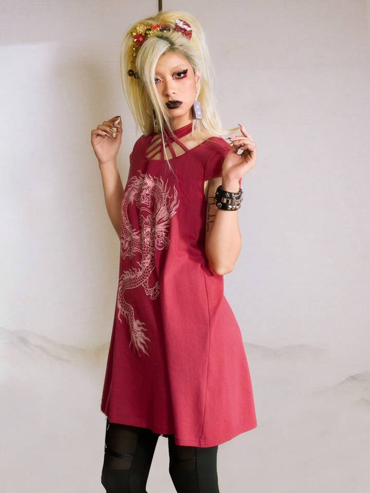 J-Fashion Women's Summer Fashion Dragon Print Halter Long T-Shirt