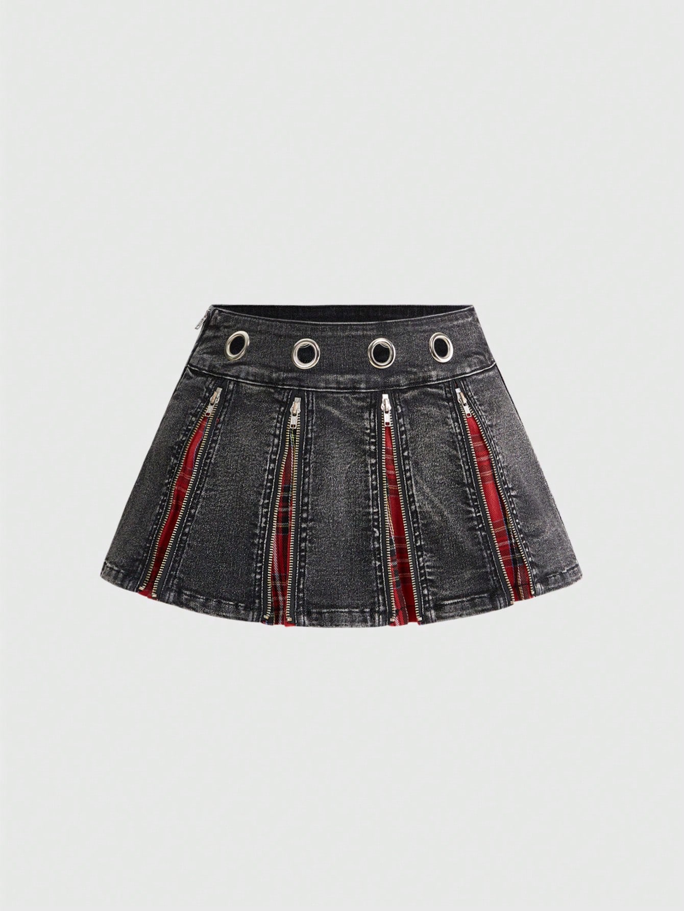 J-Fashion Women's Y2K Retro Subculture Collegiate Style Patchwork Zipper Decor A-Line Super Low Waist Sexy Denim Mini Skirt