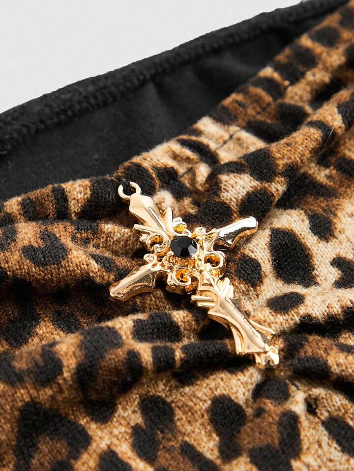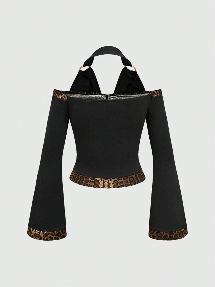 J-Fashion Y2K Gyaru Survillage Deep Draped Neck Bell Sleeve Leopard Print Mock 2 Pieces T-Shirt For Women