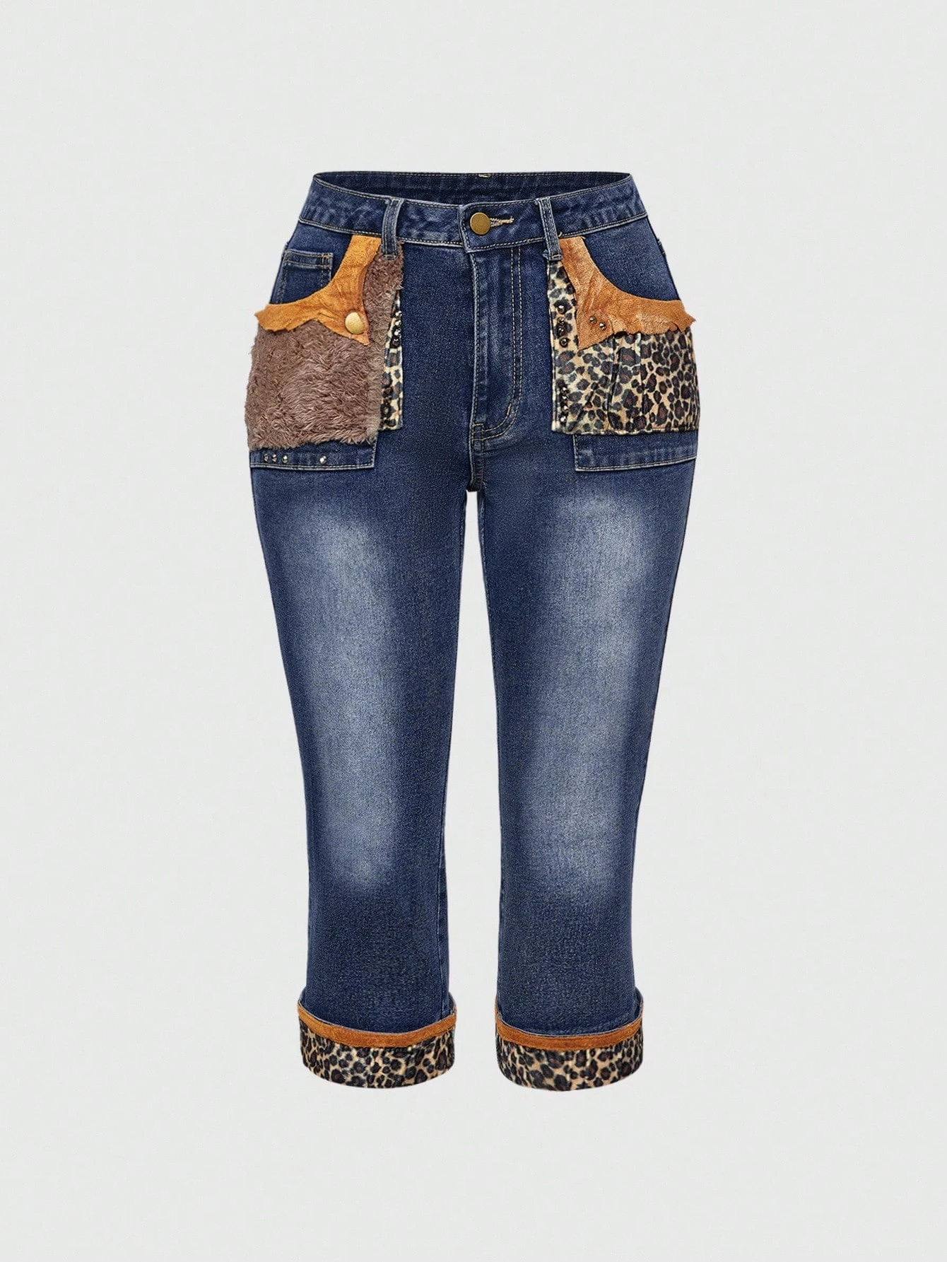 J-Fashion Y2K Low-Waist Vintage Leopard Faux Fur Patchwork Denim Capri Pants