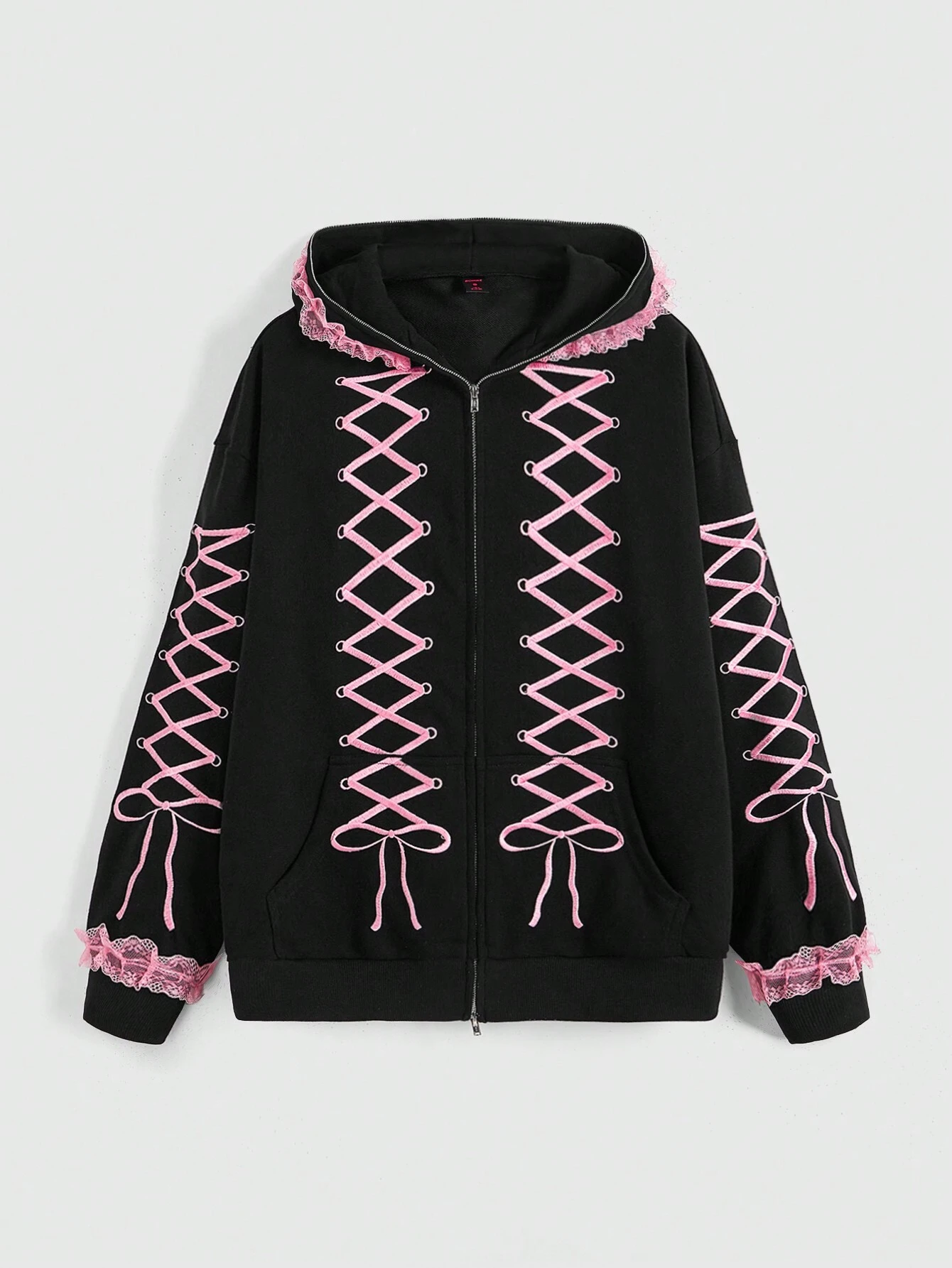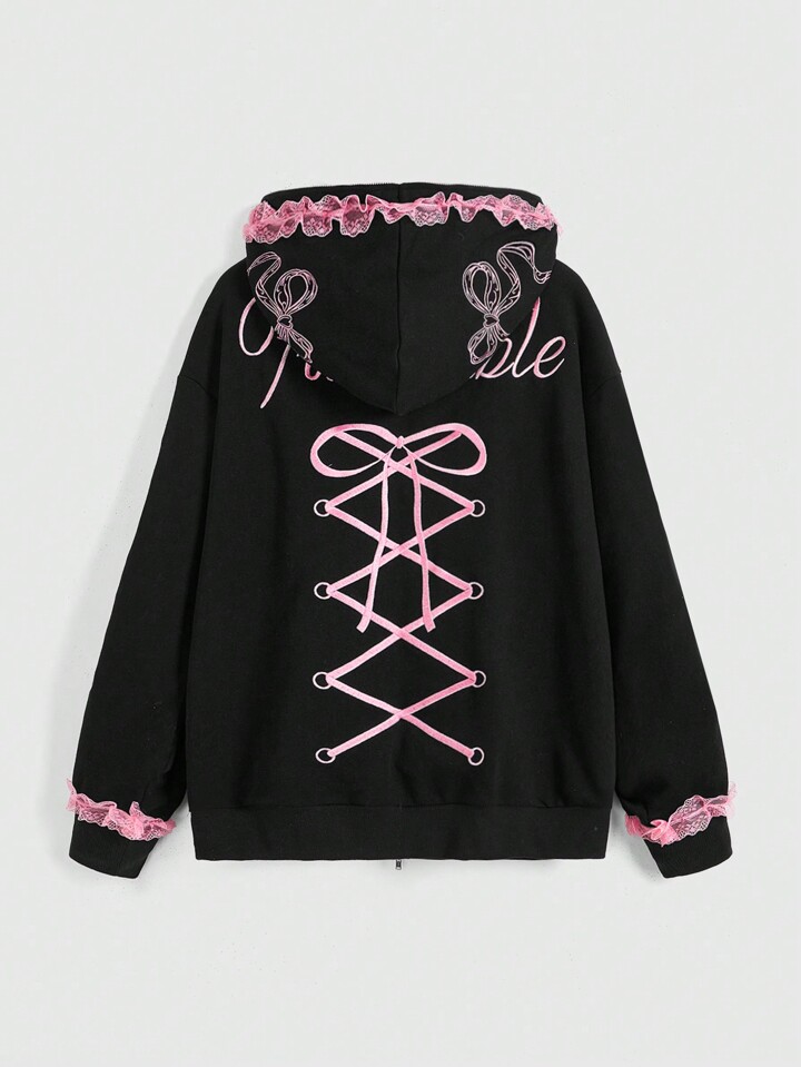 J-Fashion Y2K Style Lace Patchwork Bow Embroidery Hoodie
