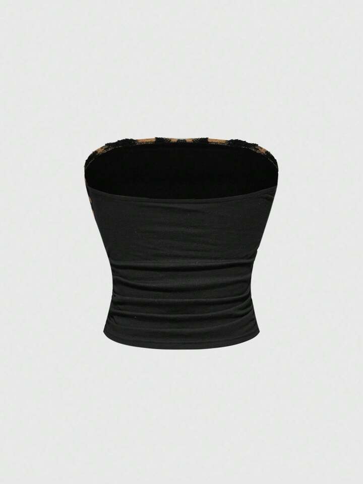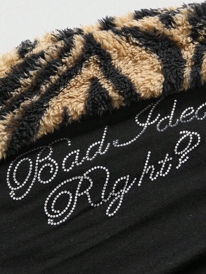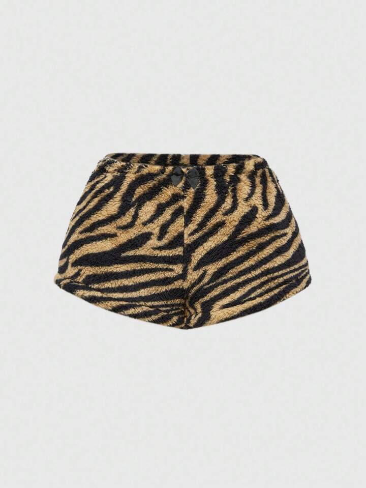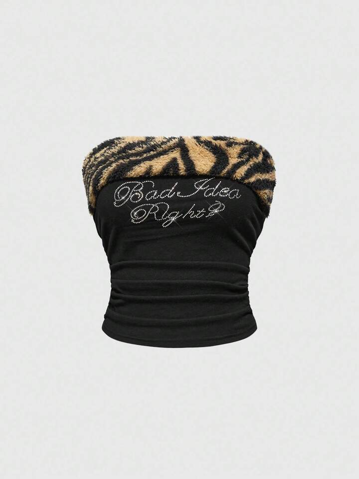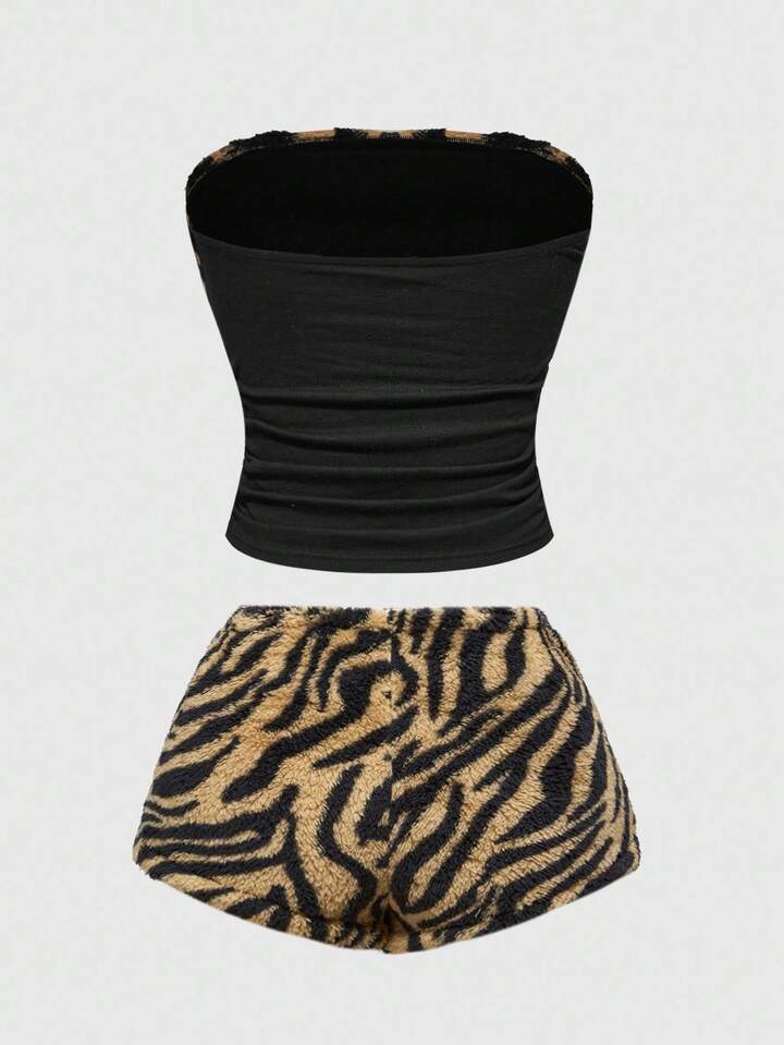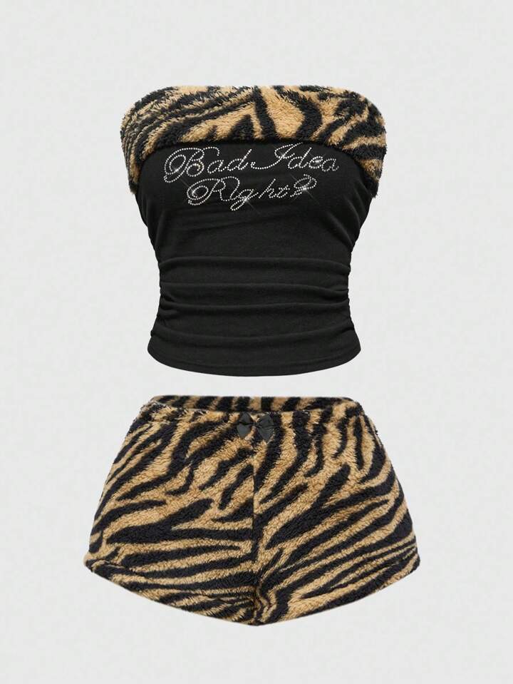 J-Fashion Y2K Style Women's 2pcs Set: Zebra Print Rhinestone Decor Tube Top And Fluffy Shorts For Casual Wear