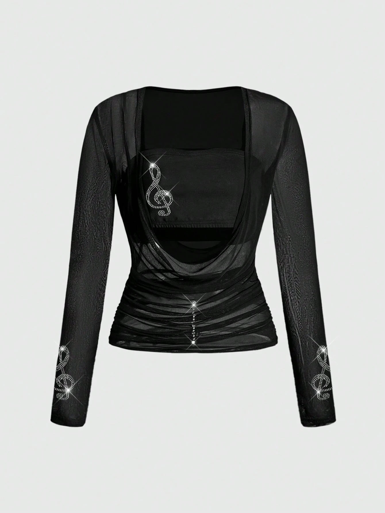 J-Fashion Y2K Vintage Ruched Waist Plunging Neck Cropped Knit Cover Up Top, 2 Pieces Set For Women