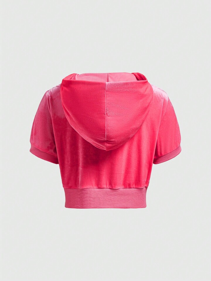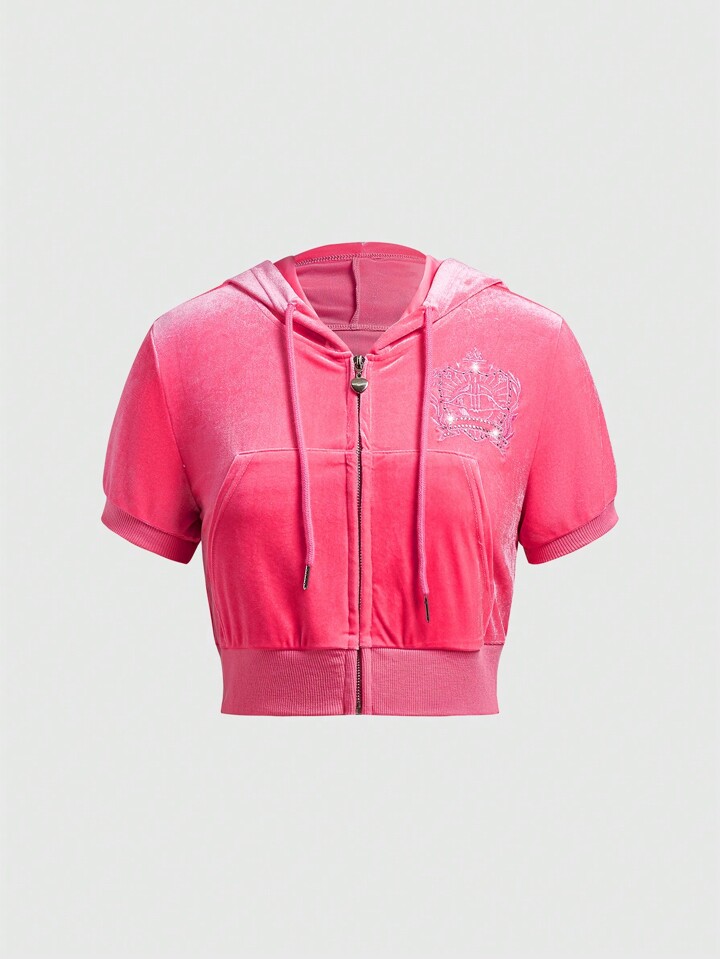 J-Fashion Y2k Short Velvet Hooded Short Sleeve Sweatshirt With Embroidery And Rhinestone Design For Women