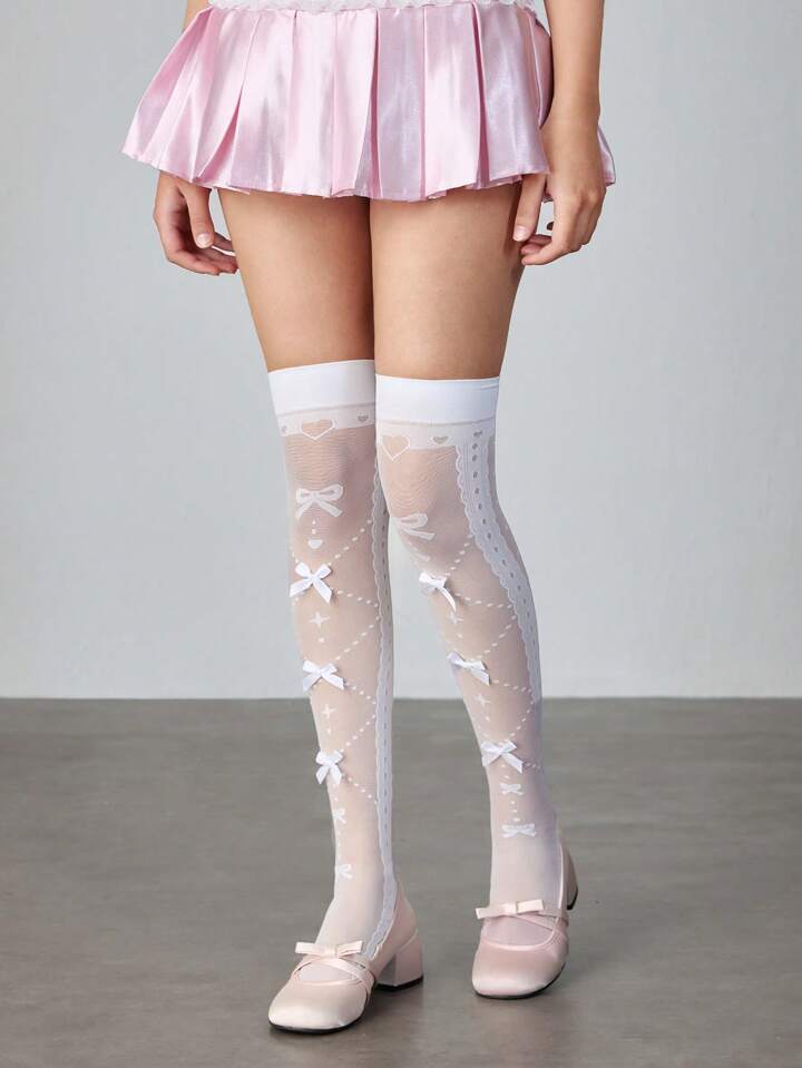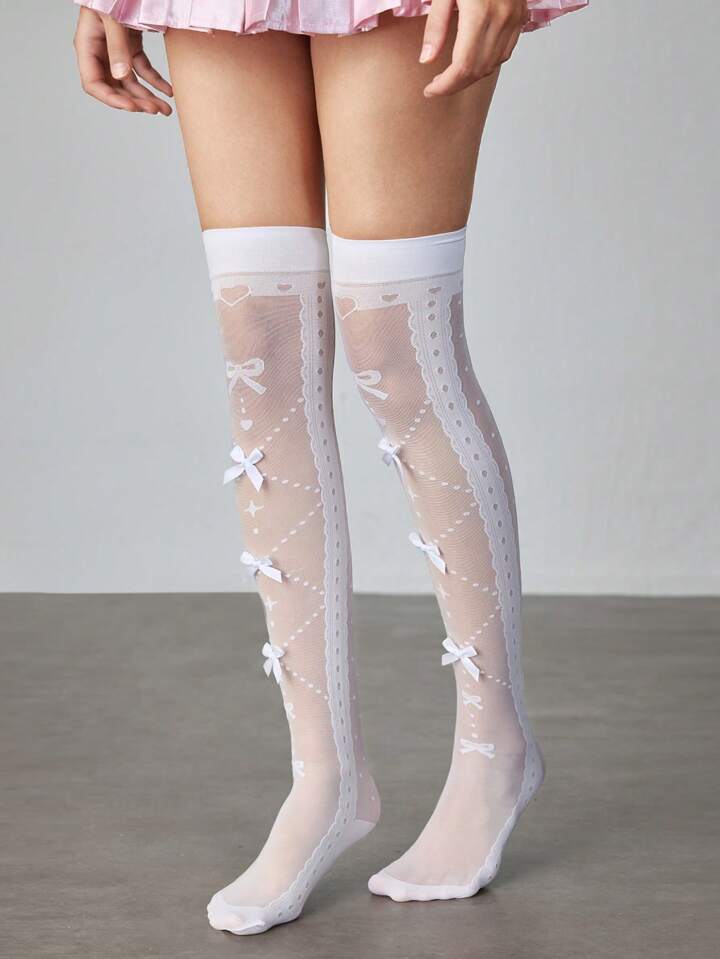 Kawaii 1 Pair Cute Bowknot Over-The-Knee Socks, Lolita Polka Dot, Star, Ultra-Thin, Elastic, Solid Color Stockings, Academy Style Ribbon Polka Dot Thigh-High Socks