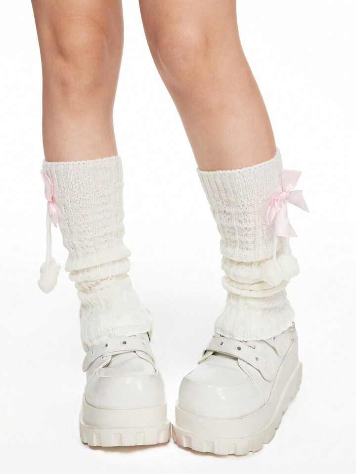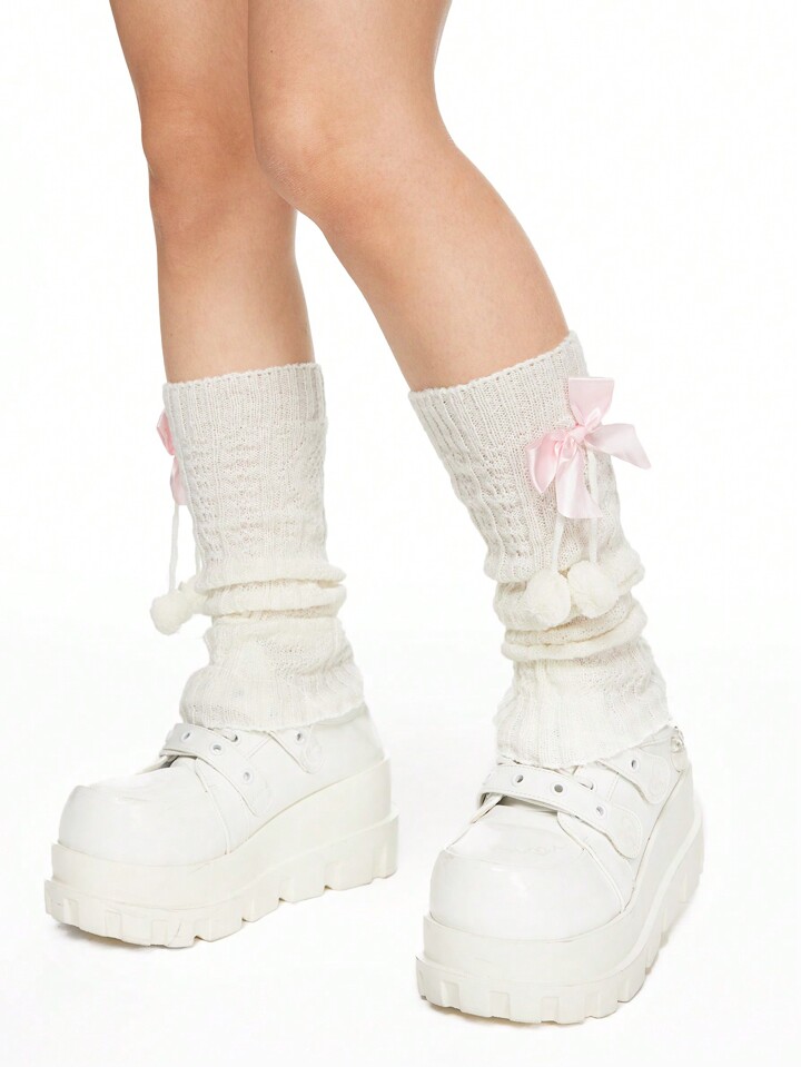 Kawaii 1 Pair Cute Knitted Leg Warmers, Colorblock Fuzzy Ball Leg Warmers, Y2K Style Bow Decor Leg Warmers, Niche Design Warm Leg Warmers
