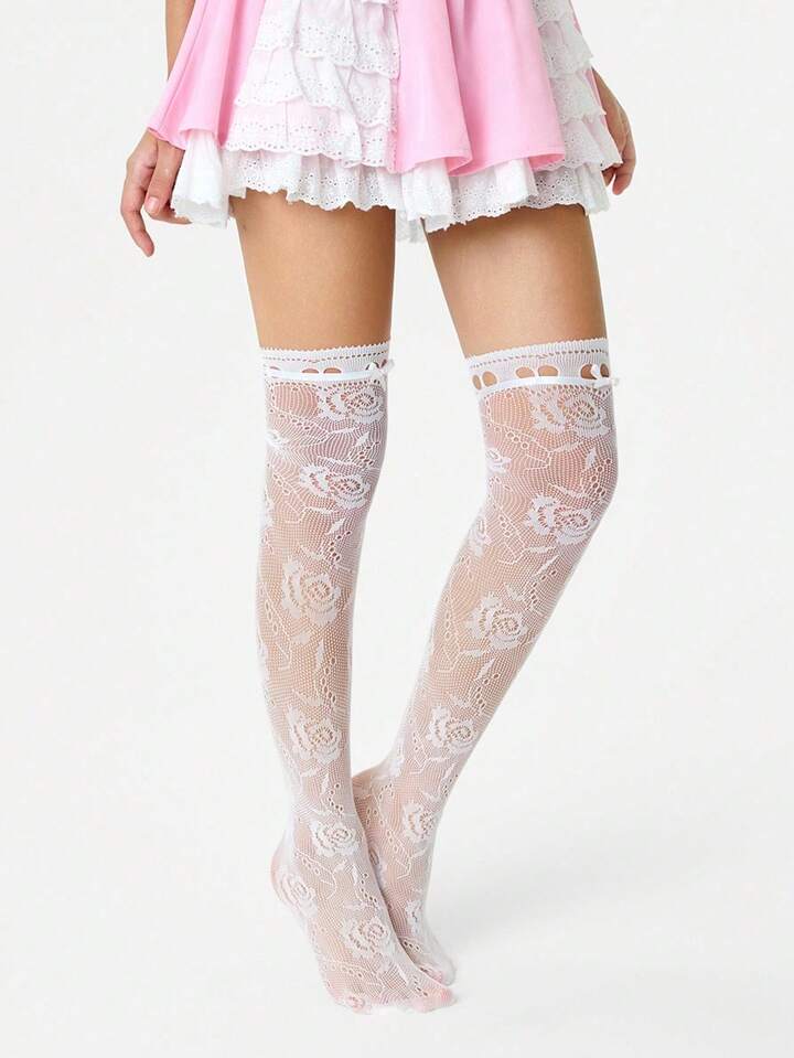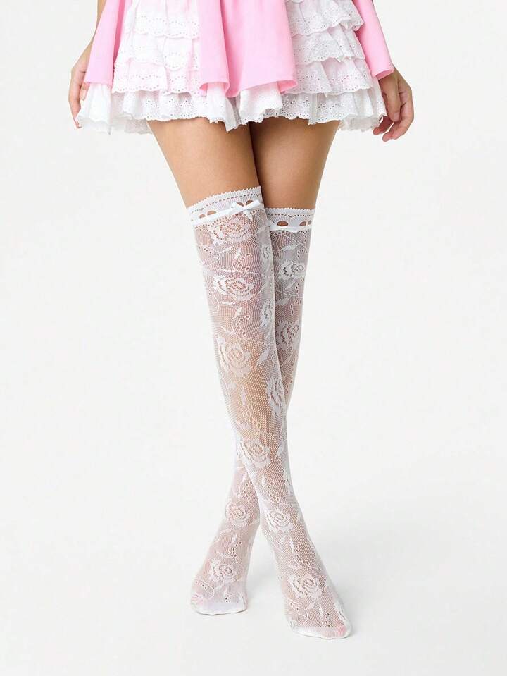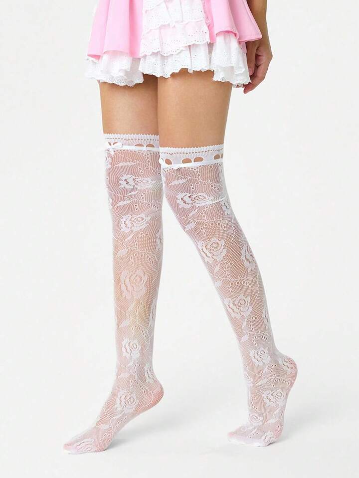 Kawaii 1 Pair Sexy Lace-Up Butterfly Hollow Out Fishnet Stockings, Cute Solid White Rose Pattern Thigh High Socks, Stretchy Sheer Mesh Stockings, Fashionable Leggings For Daily Wear And Party