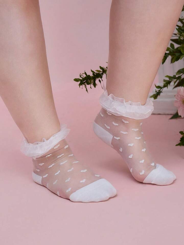 Kawaii 1 Pair White Heart Shape Lace Trim Knee High Socks, Cute & Sweet For Women