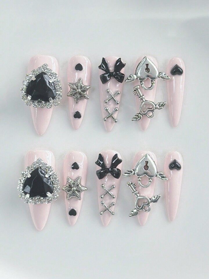 Kawaii 10pcs High-Quality, Handmade False Nails In Dark Style With Pink Bowknot & Hearts Pattern, Including 3pcs Double-Sided Adhesive, Y2K Gothic Nail Art, Detachable, Rhinestone & Hand-Painted Nail Stickers, Suitable For Festival, Party, Dance And Daily Wear