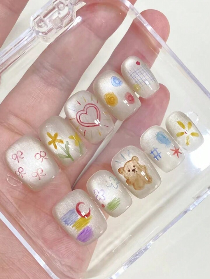 Kawaii 10pcs/Pack Short Acrylic Nail Tips, Cream Color Cat Eye & Cute Bear Design, Handmade Removable & Reusable Nail Art With Gel Glue