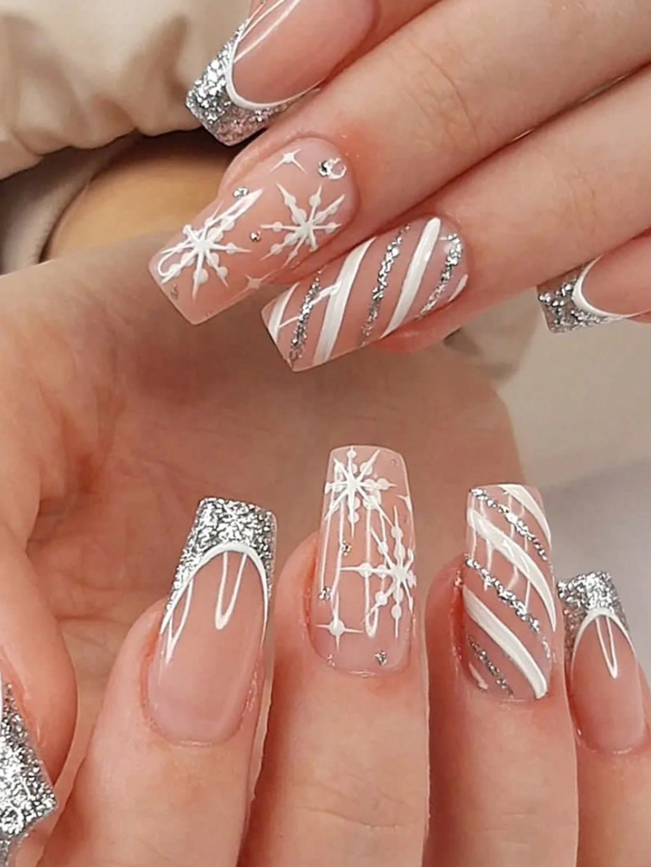Kawaii 1box/24pcs French Style Snowflake Pattern False Nails