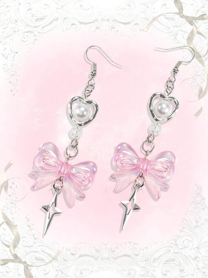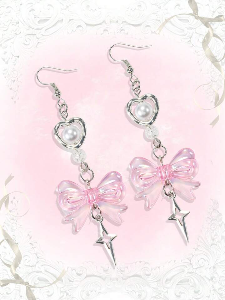 Kawaii 1pair Cartoon Sweet Heart & Bowknot Dangle Earrings Valentines,Mom,Mother,Mother's Day,Gift
