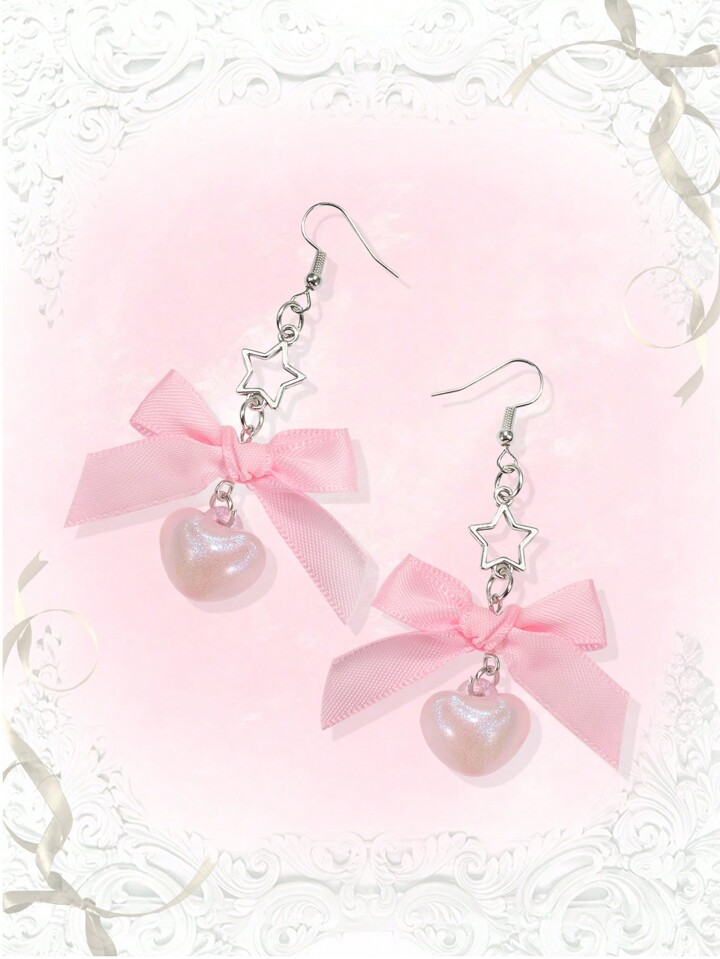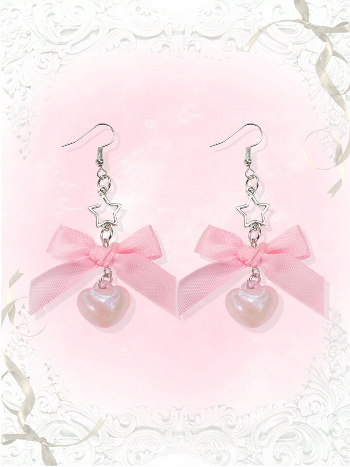 Kawaii 1pair Cute Pink Bow & Heart Shaped Dangle Earrings