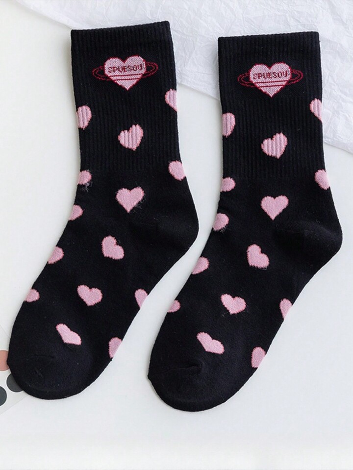 Kawaii 1pair Fashionable Mid-Calf Socks With Heart Pattern