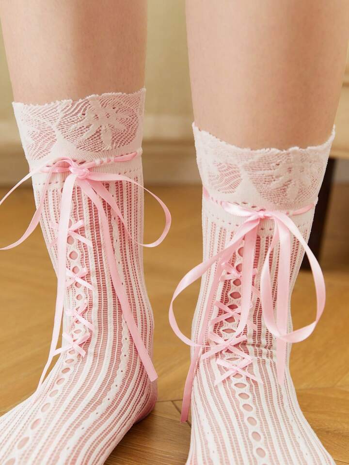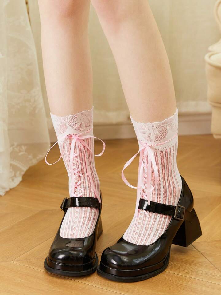 Kawaii 1pair Women's Hollow Out Fan Shaped Bowknot Lace Socks, Suitable For All Seasons